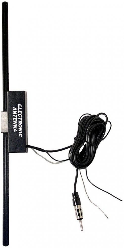 Elektronická anténa určené k montáži nalepením na sklo automobilu. Napájení 12 volt, šířka 34 cm, délka kabelu 200 cm.