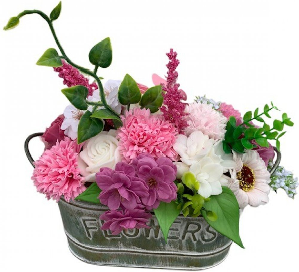 Stylová mýdlová kytice Jaruška je romantické, jemně laděné aranžmá v růžovo-fialových a bílých tónech, které okamžitě zútulní každý prostor. Kytice je zasazená do pevného plechového obalu ve vintage stylu, díky kterému působí čistě, stabilně a je připravená rovnou k vystavení – bez zalévání, bez vadnutí, bez údržby.