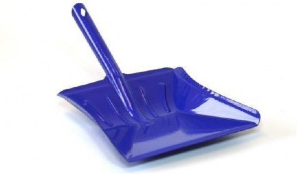 Odolná lopatka na smetí, vyrobena ze slabého plechu.