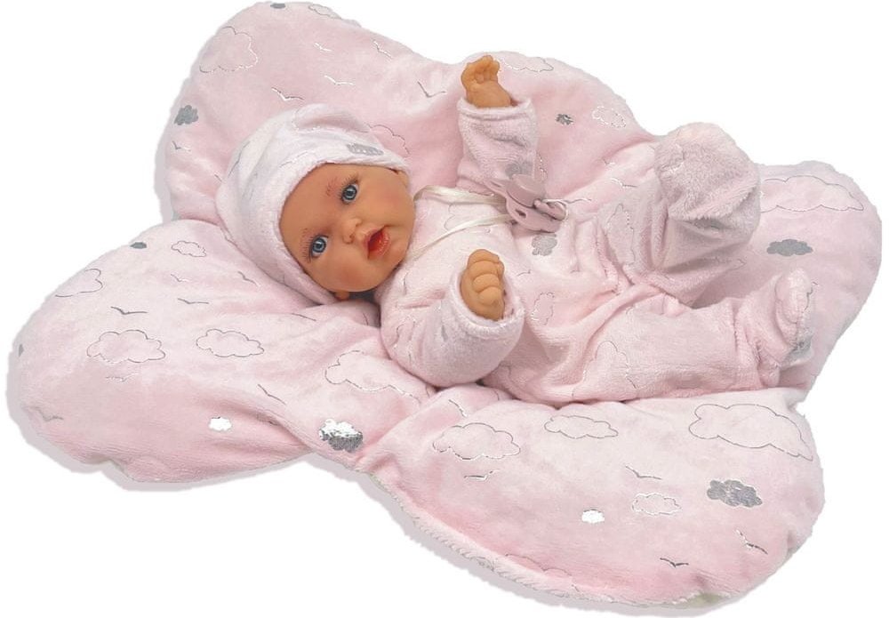 Ručně vyrobená panenka s měkkým látkovým tělem a zabudovanou speciální kostrou, umožňující miminku různé pohyby. Velikost 27 cm, materiál: měkčený vinyl, bavlna. Vyrobeno ve Španělsku - Onil. Doporučený věk od 3 let.Ručně vyrobená realistická španělská panenka - miminko, se speciální pohybovou funkcí. Díky vnitřní opoře kostry těla, může dělat neobvyklé pohyby končetin, jako překřížit nožičky vleže, dát k sobě dlaně nebo zaujímat různé miminkovské polohy. Miminko má měkké látkové tělo, hlava a končetiny jsou vyrobené z kvalitního měkčeného vinylu. Oblečení některých panenek bylo vyrobeno z organické bavlny, která zaručuje výrobu z ručně sbírané, ekologicky bez chemického ošetření pěstované bavlny. Firma Antonio Juan klade velký důraz na ekologii a proto jako první využívá v tomto odvětví zmíněnou bavlnu. Velikost 27 cm. Baleno v dárkové krabici. Doporučený věk od 3 let.