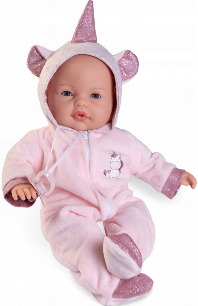 Mrkací a plačící, ručně vyrobená španělská panenka - miminko, reagující na magnetický dudlík. Po vytažení dudlíku z úst začne panenka říkat „máma“, „papá“ a vydávat reálný zvuk plačícího dítěte, který lze utišit dudlíkem. Panenka má měkké látkové tělo, hlava a končetiny jsou vyrobeny z kvalitního měkčeného vinylu. Oblečení některých panenek bylo vyrobeno z organické bavlny, která zaručuje výrobu z ručně sbírané, ekologicky bez chemického ošetření pěstované bavlny. Firma Antonio Juan klade velký důraz na ekologii a proto jako první využívá v tomto odvětví zmiňovanou bavlnu. Velikost 37 cm. Baleno v dárkové krabici. Součástí balení je 3 x knoflíková baterie LR44 s návodem na její výměnu. Baterie jsou spotřební zboží a proto jejich vybití není důvodem k reklamaci panenky.
