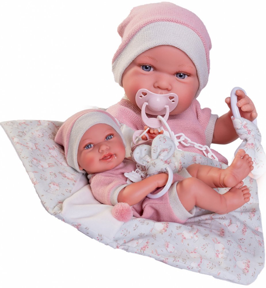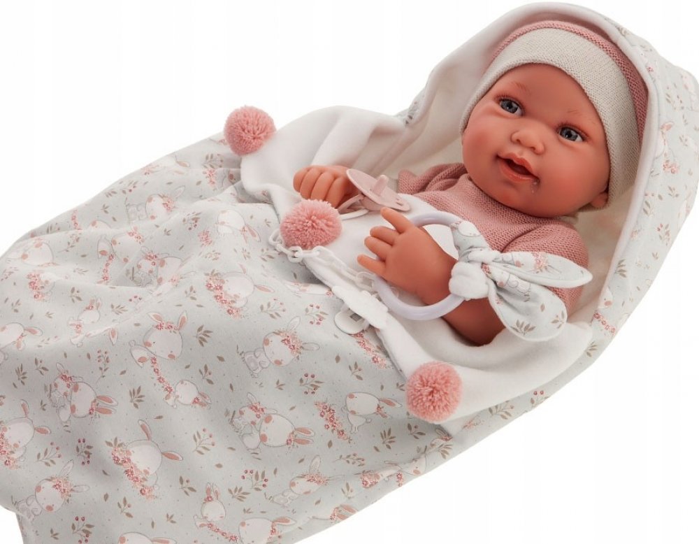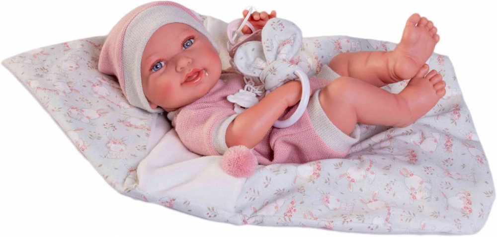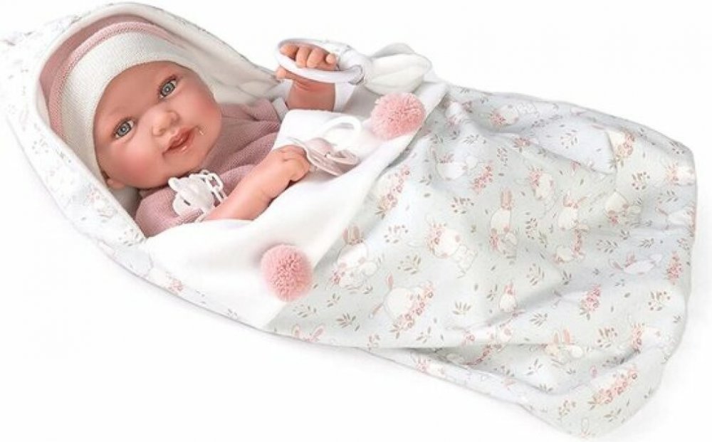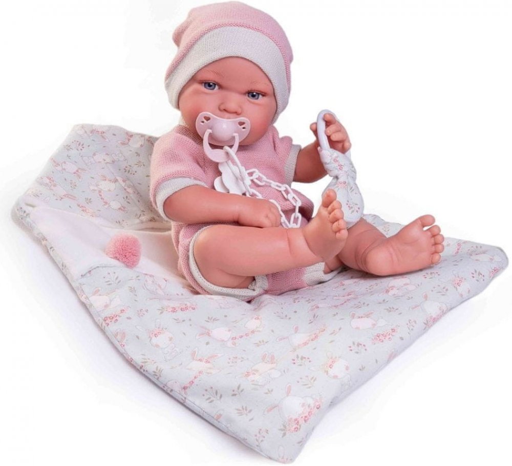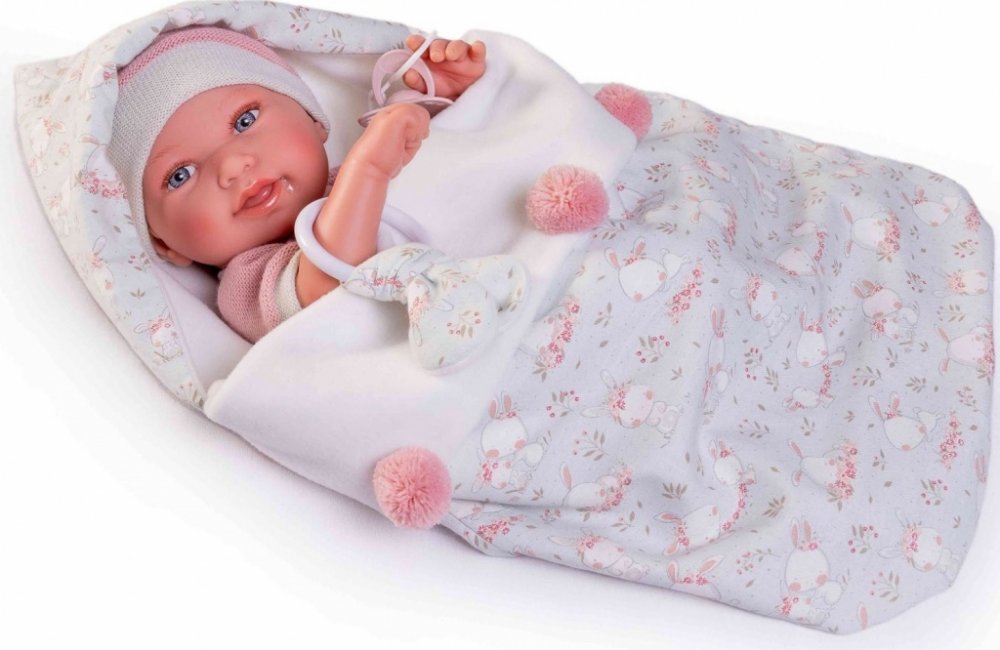 Ručně vyrobená realistická španělská panenka - miminko new born s celovinylovým tělem a realistickým vyobrazením různých miminkovských faldíků a detailů včetně pohlaví. Panenka je vyrobená ze speciálního měkčeného vinylu, velmi příjemného na dotek. Miminko lze koupat, ale je potřeba dát pozor, aby se nenamočily řasy. Odlepené řasy nejsou pak důvodem k reklamaci. Oblečení některých panenek bylo vyrobeno z organické bavlny, která zaručuje výrobu z ručně sbírané, ekologicky bez chemického ošetření pěstované bavlny. Firma Antonio Juan klade velký důraz na ekologii a proto jako první využívá v tomto odvětví zmíněnou bavlnu. Velikost 42 cm. Baleno v dárkové krabici. Doporučený věk od 3 let.
