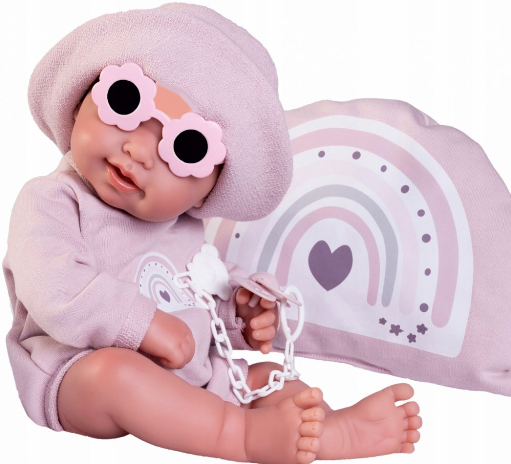Obsah balení: panenka, oblečení, dudlík, sluneční brýle, polštářek