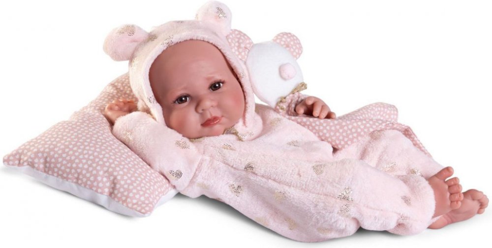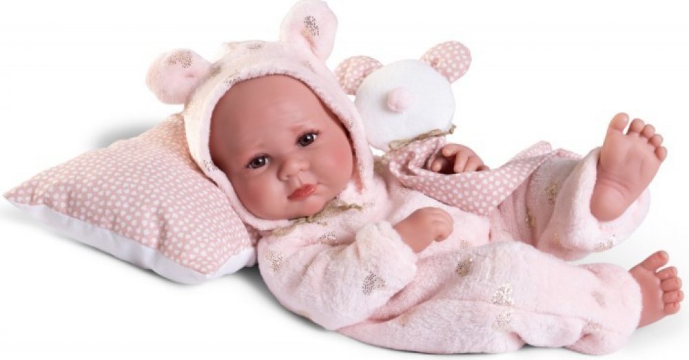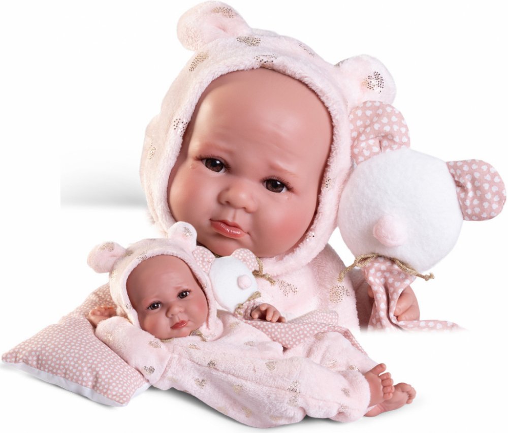 Ručně vyrobená realistická španělská panenka - miminko new born s celovinylovým tělem a realistickým vyobrazením různých miminkovských faldíků a detailů včetně pohlaví. Panenka je vyrobena ze speciálního měkčeného vinylu, velmi příjemného na dotek. Miminko se dá koupat, ale je třeba dát pozor, aby se nenamočily řasy. Odlepené řasy nejsou pak důvodem k reklamaci. Oblečení některých panenek bylo vyrobeno z organické bavlny, která zaručuje výrobu z ručně sbírané, ekologicky bez chemického ošetření pěstované bavlny. Firma Antonio Juan klade velký důraz na ekologii a proto jako první využívá v tomto odvětví zmiňovanou bavlnu. Velikost 42 cm . Baleno v dárkové krabici. Doporučený věk od 3 let .
