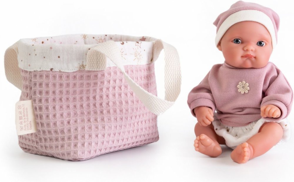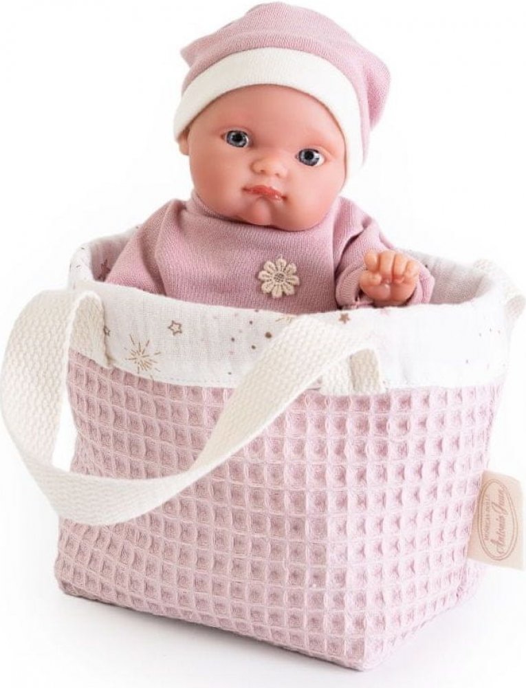 Ručně vyrobená realistická španělská panenka - miminko new born s celovinylovým tělem a realistickým vyobrazením různých miminkovských faldíků a detailů včetně pohlaví. Panenka je vyrobená ze speciálního měkčeného vinylu, velmi příjemného na dotek. Oblečení některých panenek bylo vyrobeno z organické bavlny, která zaručuje výrobu z ručně sbírané, ekologicky bez chemického ošetření pěstované bavlny. Firma Antonio Juan klade velký důraz na ekologii a proto jako první využívá v tomto odvětví zmíněnou bavlnu. Velikost 21 cm. Součástí balení je i taška na nošení. Baleno v dárkové krabici. Doporučený věk od 3 let.