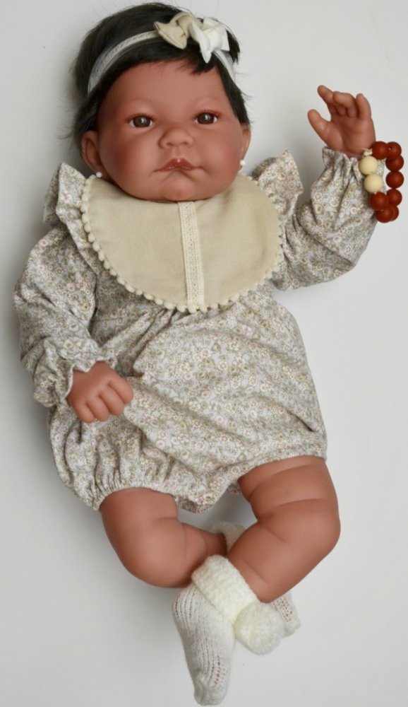 Krásné realistické miminko, holčička Nica je vyrobená ve Španělsku firmou Antonio Juan. Holčička je 40 cm dlouhá, má měkké-látkové tělo, jen hlavička a končetiny jsou vyrobeny z měkčeného vinylu. Končetiny jsou k tělu připojeny klouby, tudíž miminko může samo sedět a pohybovat končetinami. Má hnědé nemrkací oči a krátké černé vlásky ozdobené bílou čelenkou. Holčička je oblečená ve světlém over...