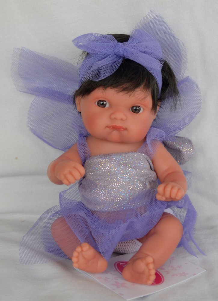 Miminko holčička z kolekce Mufly - barevné víly - (hadas de colores) je vyrobené ve Španělsku firmou Antonio Juan. Mufly je 21 cm dlouhá, má tělíčko vyrobené z kvalitního měkčeného vinylu. Miminko má zobrazené pohlaví. Má černé vlásky a světle hnědé oči.