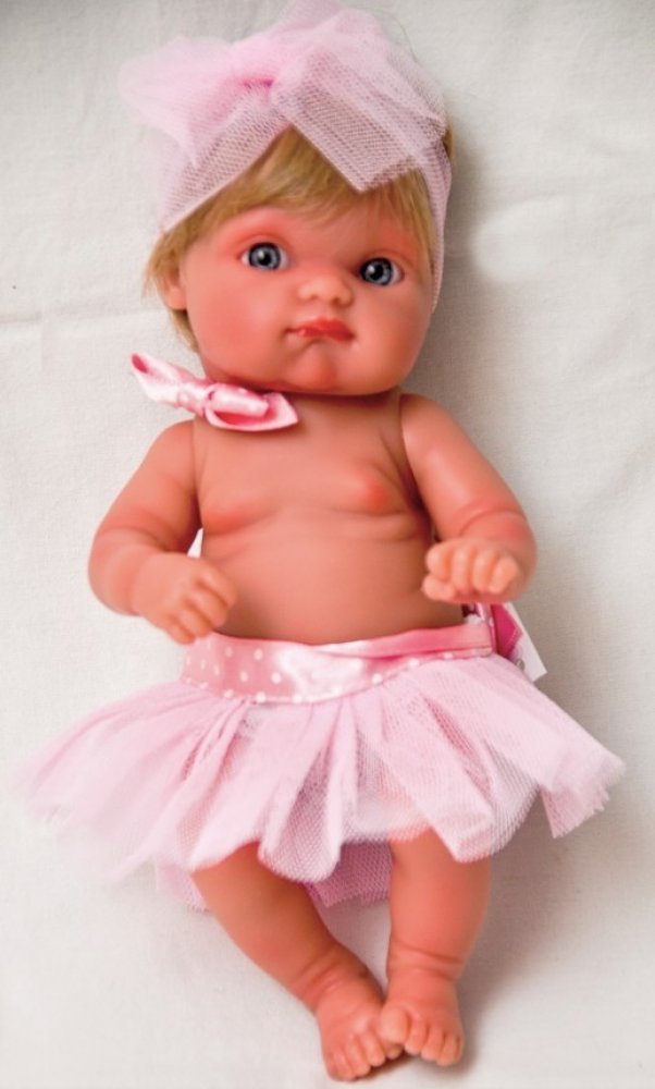 Miminko holčička z kolekce Mufly je vyrobené ve Španělsku firmou Antonio Juan. Je 21 cm dlouhá, má tělíčko vyrobené z kvalitního měkčeného vinylu. Miminko má zobrazené pohlaví. Má světlé vlásky a modré oči. Oblečenou má světle-růžovou sukni
