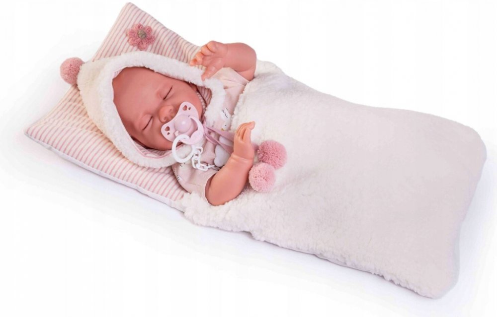 Spící, ručně vyrobená realistická španělská panenka - miminko s realistickými prvky v obličeji a na končetinách. Ruce a nohy jsou k tělu přichycené kloubem s možností polohování, což miminku umožňuje dát si ve spánku třeba ručičky za hlavu. Panenka má měkké látkové tělo, hlava a končetiny jsou vyrobené ze speciálního měkčeného vinylu, příjemného na dotek. Oblečení některých panenek bylo vyrobeno z organické bavlny, která zaručuje výrobu z ručně sbírané, ekologicky bez chemického ošetření pěstované bavlny. Firma Antonio Juan klade velký důraz na ekologii a proto jako první využívá v tomto odvětví zmíněnou bavlnu. Velikost 42 cm. Baleno v dárkové krabici. Doporučený věk od 3 let.