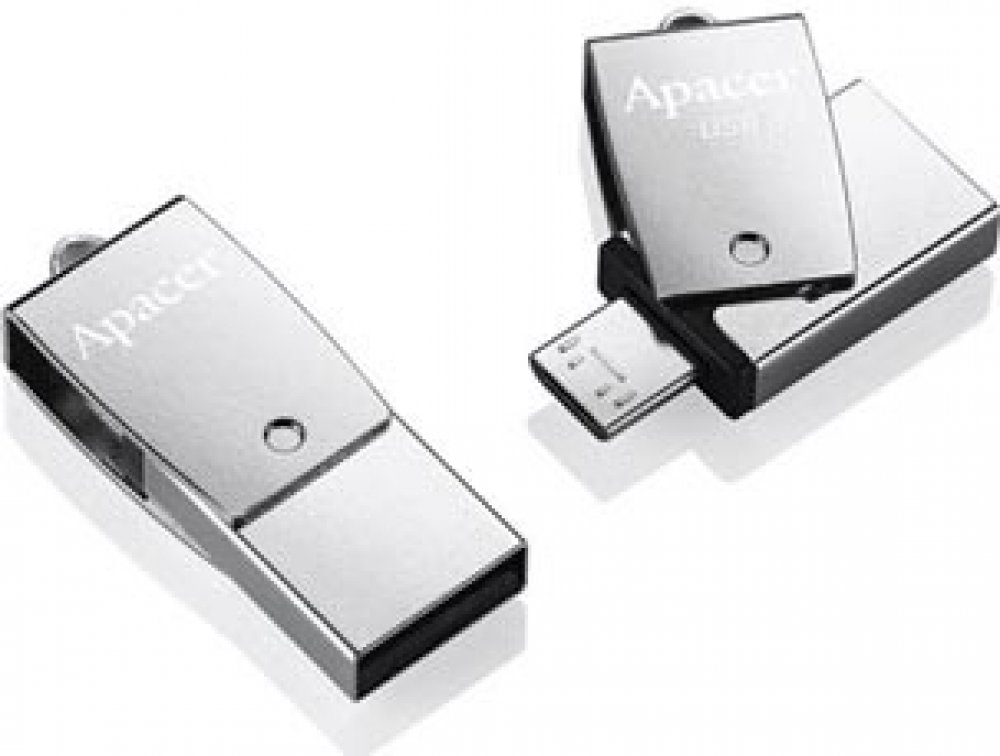 Apacer USB flash disk OTG, USB A/micro USB, stříbrný, s otočnou krytkou, AH750Malý, celokovový USB disk v elegantním stříbrném provedení; disponuje otočnou krytkou, díky které bude USB port, který zrovna nepoužíváte, vždy chráněný.