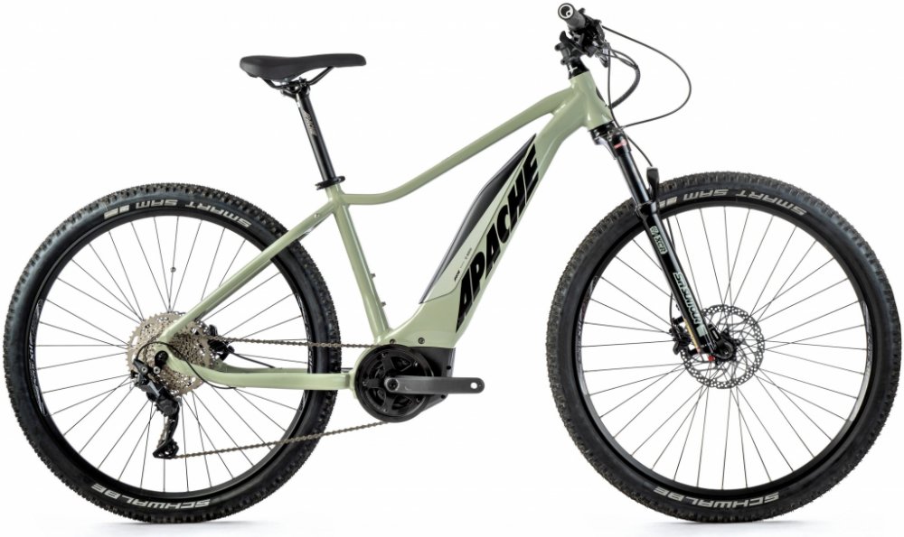 Apache horská pánská 2024 150 km se středovým motorem semiintegrované Bosch s odpruženou přední vidlicí 100 mm kotoučové s hliníkovým rámem Bosch Performance Line Gen. 3 65 Nm