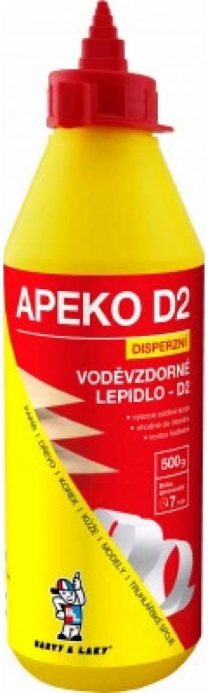 APEKO D2 je univerzální vodouředitelné lepidlo na dřevo s prodlouženou dobou fixace, rychlým zasycháním, tvořící vysoce pevné elastické spoje. Je určené pro lepení měkkého i tvrdého dřeva, zejména pak dřevěné dýhy, překližky, dřevotřísky, papíru, kartonu, spárovek, spojů truhlářských a montážních. Dále se uplatní v modelářství či obalové technice k plošným lisovaným lepům a v interiéru k vodovzdor...