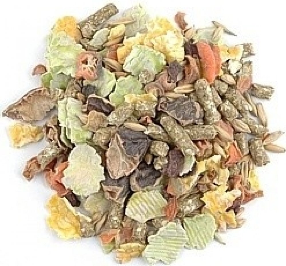 Vojtěškové úsušky, sušená mrkev, vločky kukuřičné, vločky hrachové, červená řepa, extrudované obilniny, vločky ovesné, vločky fazolové, extrudovaná vojtěška.