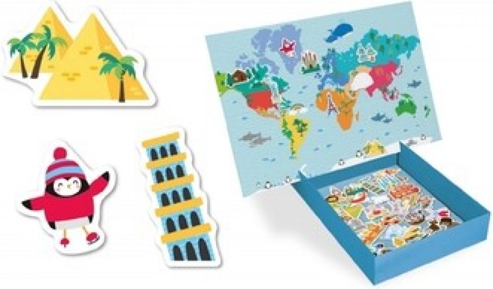 Zábavná hra na magnetickém podkladu s potištěnými magnety památek a zvířátek, která jsou charakteristická pro jednotlivá místa ve světě.