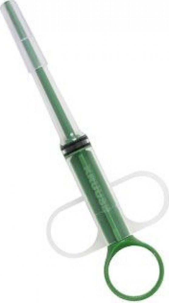 Mezi koncové čelisti zasuňte podávanou tabletu, uchopte podavač tak, abyste měli palec připraven v zeleném držadle pístu. Podavač vsuňte do tlamy zvířete až ke kořeni jazyka. Pístem uvolněte tabletu a zvířeti rychle zavřete a mírně zakloňte hlavu, aby bylo nuceno polknout.