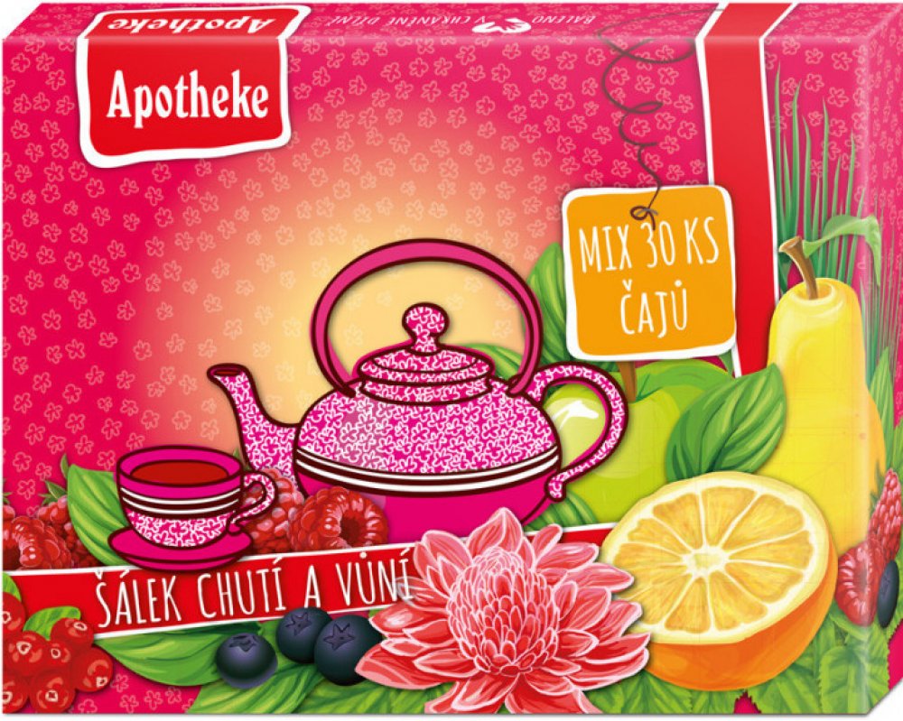 Kolekce prémiových ovocných čajů, která potěší všechny příznivce výrazných chutí a bohatého aroma... Dárková kazeta Vám nabízí pestrou škálu nejrůznějších zajímavých i osvědčených ovocných kombinací. Kolekce vybraných prémiových ovocných čajů, vhodná třeba jako drobný dárek. Balení obsahuje 6 druhů čaje, od každého po 5 nálevových sáčcích. Složení: AKTIVNÍ DEN: Jablko plod, yerba mate list (20%), ostružina list, aroma (7,5%), skořice kůra (5,5%), zázvor kořen (5%), hřebíček květ, kyselina citronová, čekanka kořen, kyselina jablečná, ibišek květ, šípek plod, pomerančová kůra (1%). Obsahuje přirozený zdroj kofeinu. BORŮVKA BRUSINKA: Ibišek květ, jablko plod, ostružina list, aronie plod, aroma, kyselina citronová, brusinka plod (1%), borůvka plod (0,5%). DIVOKÁ TŘEŠEŇ: Ibišek květ, jablko plod, aroma, ostružina list, lékořice kořen, šípek plod, kyselina citronová, třešeň plod (1%), pomerančová kůra, jahoda plod, acerola extrakt. HRUŠKA A RAKYTNÍK: Jablko plod, ibišek květ, ostružina list, aroma, šípek plod, rakytník plod (5%), kyselina citronová, čekanka kořen, hruška plod (1%), banán plod. MALINA A JAHODA: Ibišek květ, jablko plod, ostružina list, malina plod (8%), kyselina vinná, aroma, kyselina citronová, jahoda plod (1%), echinacea nať (1%), šípek plod. POMERANČ A GUARANA: Jablko plod, ostružina list, ibišek květ, čekanka kořen, aroma, kyselina citronová, pomerančová kůra (4%), šípek plod, guarana semeno (2%), ananasová šťáva, broskev plod, vanilka, meruňková šťáva. Příprava: 1 nálevový sáček zalijte 250 ml vroucí vody a nechte 3-5 min vyluhovat. Doporučené dávkování: 1-3 šálky denně. Skladování: Skladujte v suchu při teplotě do 25°C. Hmotnost netto: 60 g Výrobce: MEDIATE, s.r.o., Dolní Libchavy 325, 561 16 Libchavy, ČR