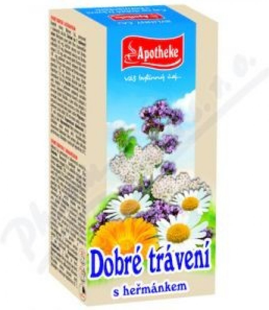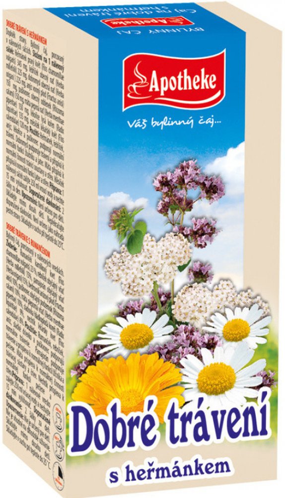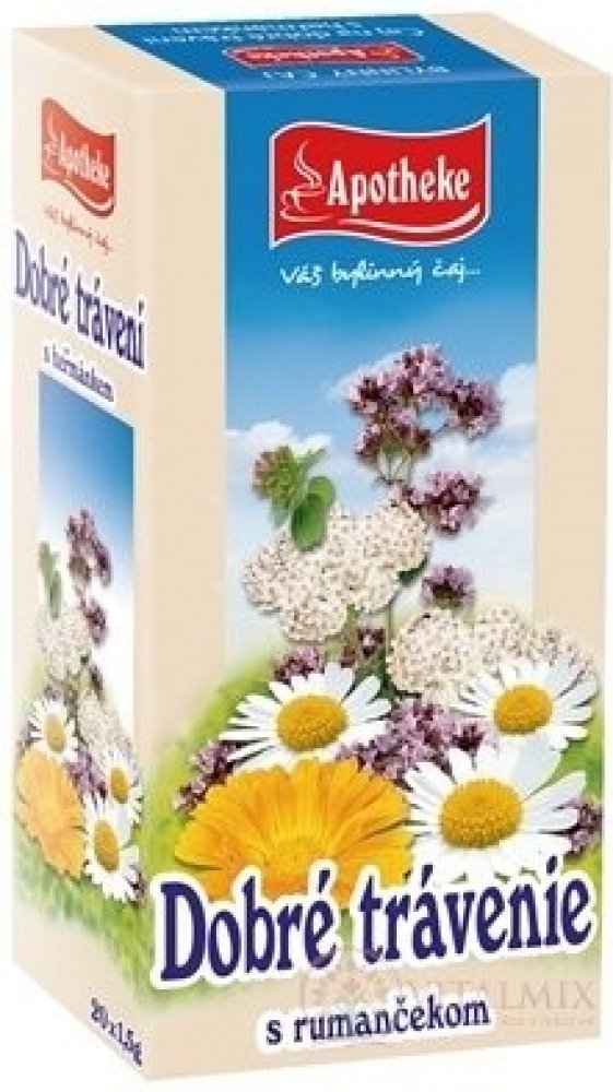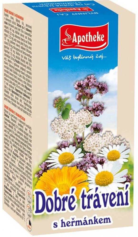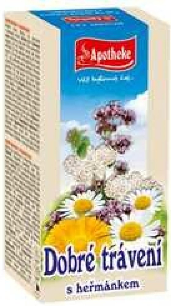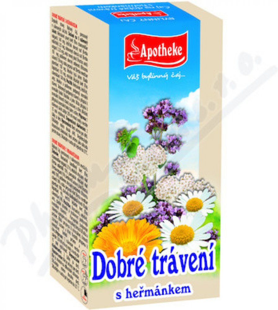 Apotheke Na dobré trávení je doplněk stravy. Bylinný čaj v nálevových sáčcích. Obsahuje heřmánek, řebříček, anýz, lékořici, puškvorec, dobromysl, mátu a měsíček.