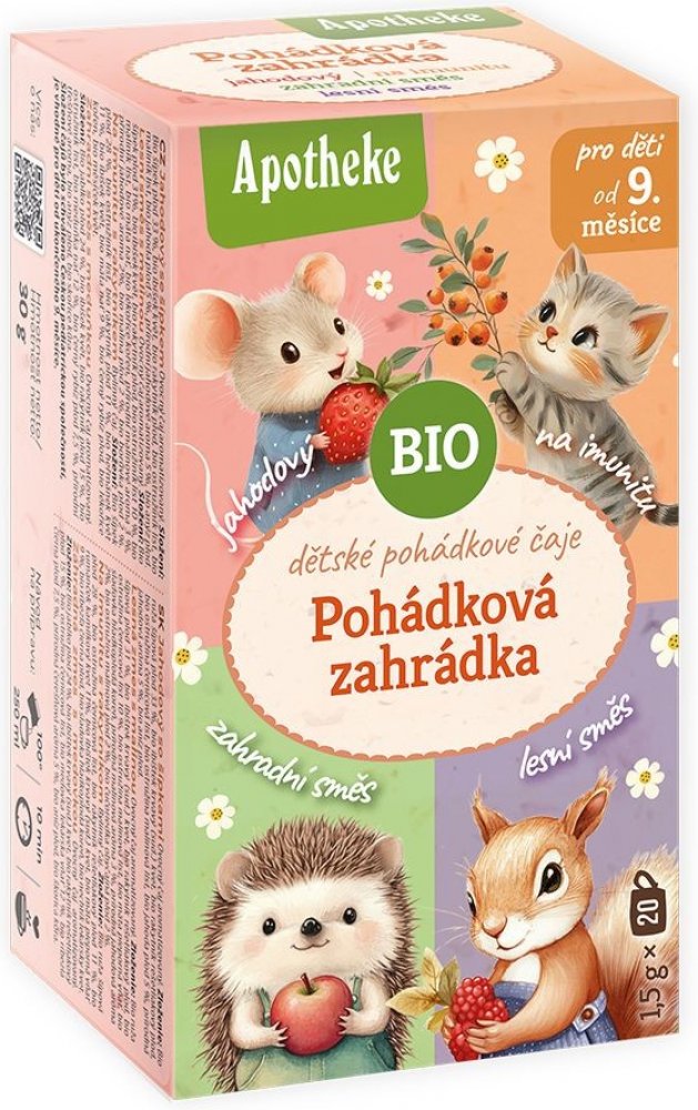 Směs bylinných a ovocných aromatizovaných čajů v nálevových sáčcích Apotheke BIO Dětský čaj Pohádková zahrada 4v1 je určen pro doplnění pitného režimu dětí od ukončeného 9. měsíce.BIO kvalita.Pro děti od 9. měsíce.Pro doplnění pitného režimu.Složení čajů bylo schváleno Českou pediatrickou společností.Balení obsahuje čaje: Lesní směs s malinou, Jahodový se šípkem, Zahradní směs s meduňkou, Na imuni...