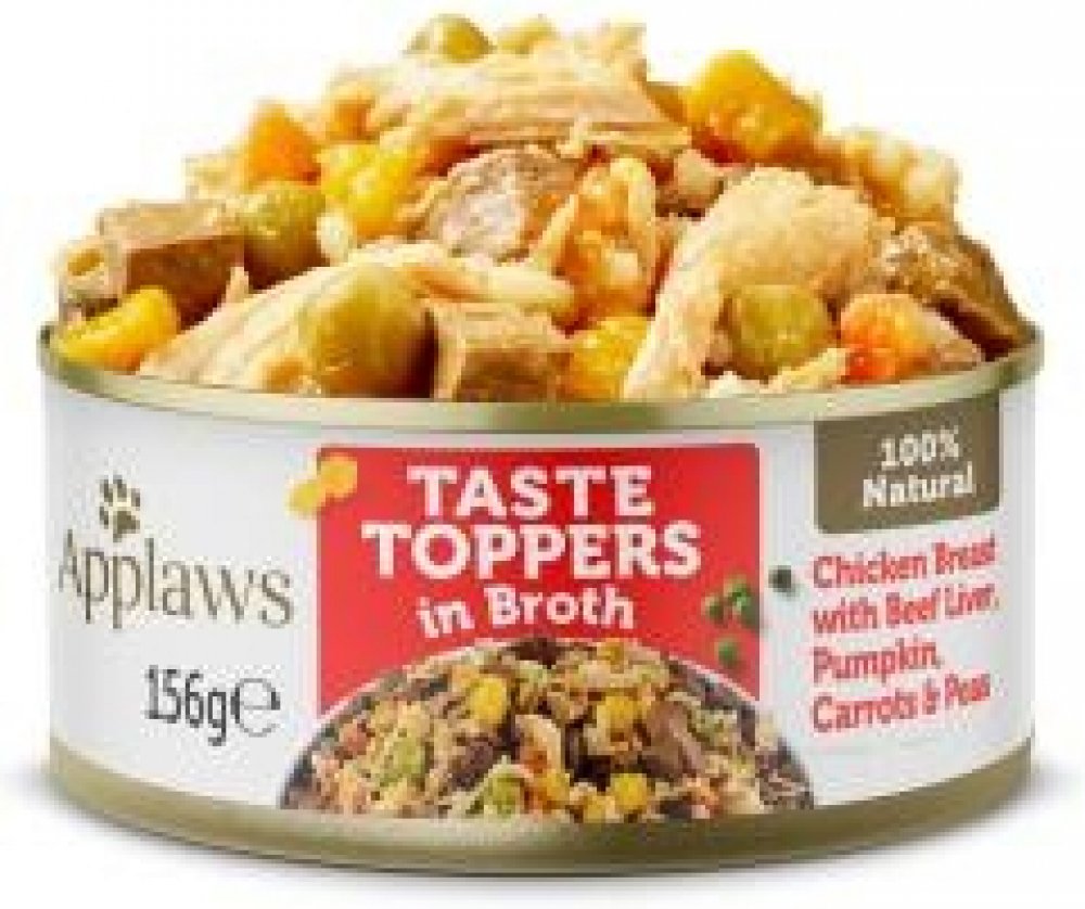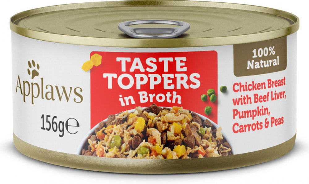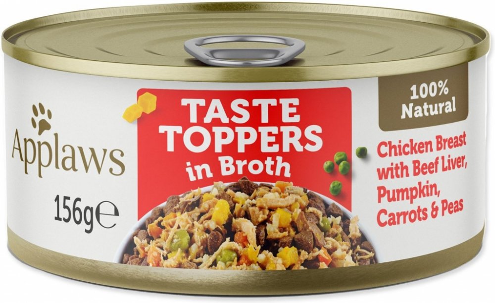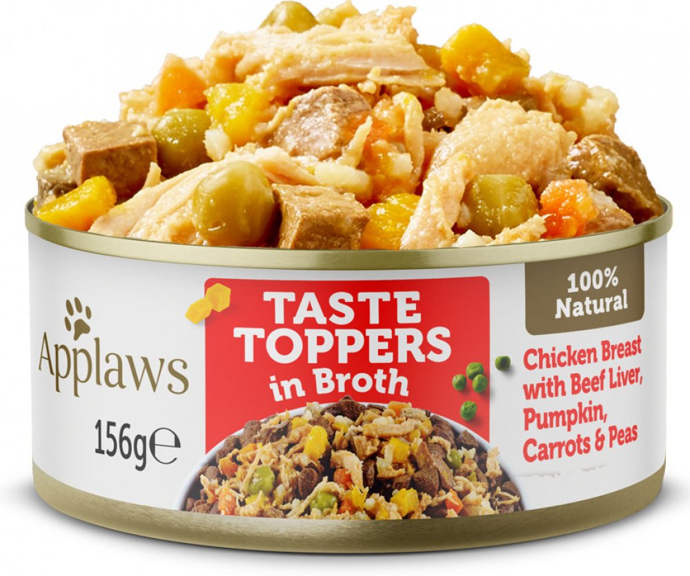Applaws konzerva Dog Taste Toppers ve vývaru Kuře s játry je plná kousků masa z kuřecích prsou, s kostičkami hovězích jater a zeleniny v jem...