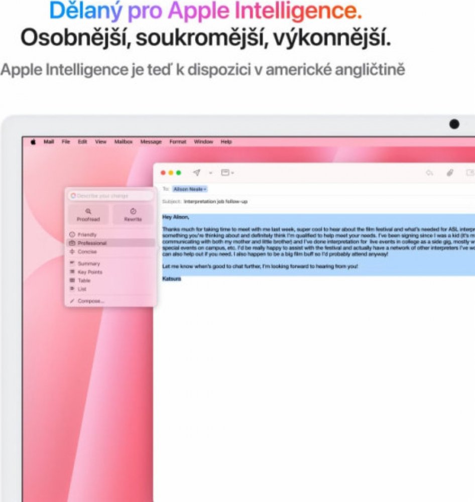 Tenhle neskutečně tenký all-in-one desktop v některé ze sedmi úchvatných barev stylově pozvedne každou místnost. S čipem Apple M4 ti půjde všechno rychleji od ruky – s lehkostí zvládá práci i zábavu, od editování fotek přes vytváření prezentací až po hry. 24palcový Retina 4,5K displej má jas 500 nitů a podporuje zobrazení až jedné miliardy barev. K dispozici je i varianta s nanotexturou, která omezuje odlesky – dostupná u stříbrných modelů se čtyřmi porty. 12MP kamera s funkcí Center Stage tě udrží ve středu záběru, zatímco tři mikrofony studiové kvality a šestice reproduktorů s prostorovým zvukem se postarají o perfektní zvuk. Všechny tvé oblíbené aplikace, od Microsoft Excelu přes Adobe Photoshop až po Zoom, běží v macOS ukrutně rychle díky čipu Apple. Mac navíc kouzelně spolupracuje s ostatními zařízeními Apple – zkopíruj něco na iPhonu a vlož to na Macu, nebo na něm vyřizuj zprávy a FaceTime hovory. iMac můžeš mít až se čtyřmi porty Thunderbolt 4 pro připojení doplňků a bleskové přenosy dat. Připojíš k němu až dva externí 6K displeje a oceníš také rychlé připojení přes Wi‑Fi 6E a Bluetooth 5.3. O soukromí a zabezpečení se starají funkce jako FileVault, integrovaná ochrana proti malwaru nebo možnost lokalizace přes aplikaci Najít. Díky bezplatným aktualizacím je tvůj Mac vždy chráněný.