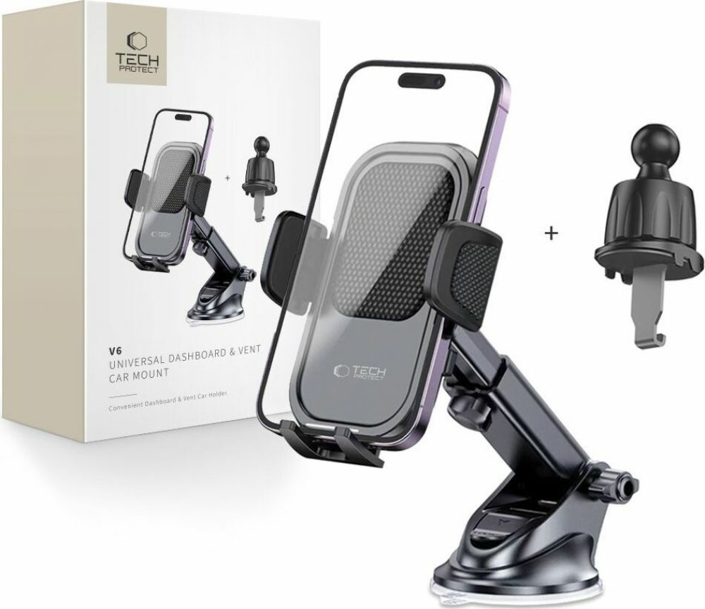 Tech-Protect V6 je univerzální držák do auta, který v sobě spojuje maximální stabilitu, pohodlí i jednoduchou montáž. Umožňuje bezpečné a ergonomické uchycení vašeho telefonu na palubní desku, čelní sklo i do ventilace vozu, takže si během jízdy snadno nastavíte polohu displeje podle aktuální potřeby. Pevné provedení a kvalitní materiály zaručují dlouhou životnost a elegantní vzhled vhodný do každého interiéru.
