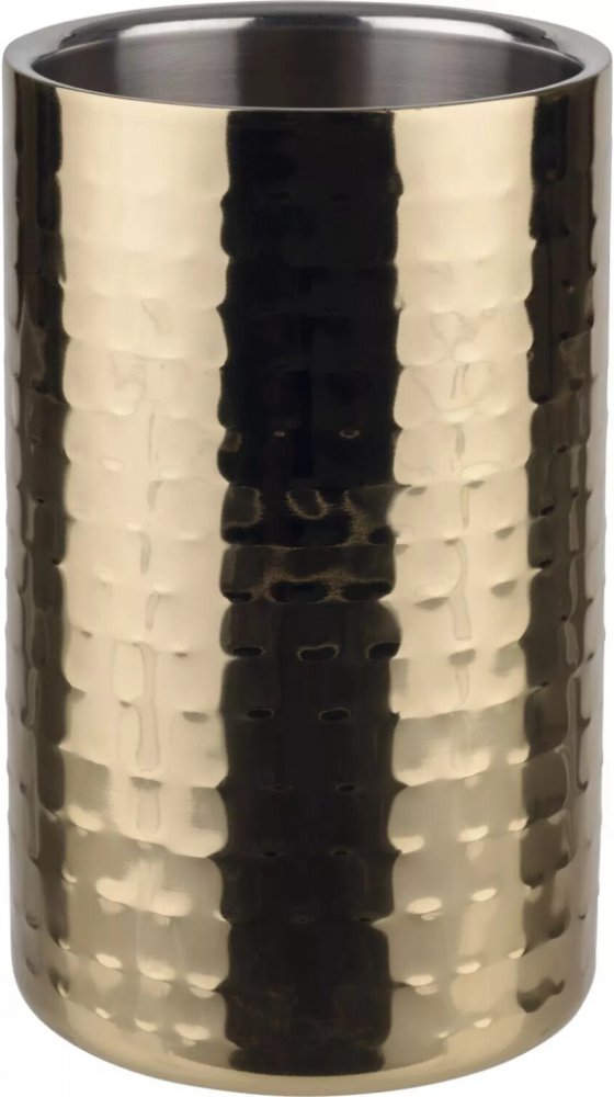 Zlatá chladicí nádoba APS s vzhledem tepaného kovu a dvojitou stěnou pro nejlepší izolaci. Určena pro láhve o objemu 0,7 - 1,5 litru. Vyrobena z nerezové oceli, výška 200 mm, průměr 120 mm. Ideální pro udržení chlazených nápojů.