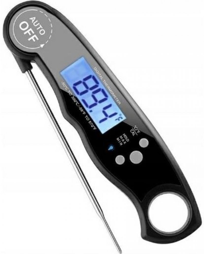 Elektronický vodotěsný kolíkový teploměr s 11,6 cm teplu odolnou sondou. Je ideální pro měření teploty uvnitř připravovaného jídla. Přístroj má čitelný, podsvícený LCD displej, který usnadňuje čtení měření. Dlouhá, žáruvzdorná sonda usnadňuje vložení do jídla a měření teploty např. masa. Teploměr má spoustu užitečných funkcí, jako je například možnost uložit měření nebo jej připevnit na magnet. Díky velmi širokému teplotnímu rozsahu a voděodolnosti IP67 je to dokonalý nástroj, který nám výrazně usnadňuje kontrolu teploty pečených jídel a kuchyňské práce! Vlastnosti produktu: Zcela nový produkt, vysoká kvalita. Má pohodlná ovládací tlačítka, kterými lze rychle a snadno zvýraznit obrazovku, změnit jednotku nebo uložit měření! Teploměr vám umožňuje pro pohodlné ovládání teploty jakéhokoli produktu. Neocenitelné, když nechcete koláč nebo opékání připálit nebo nedopéct! Vybaveno dlouhou nerezovou sondou zakončenou teplotním čidlem, které zvyšuje přesnost měření! Vybaveno velkým a velmi přehledným, podsvíceným LCD displejem pro odečítání teploty. Má speciální otvor pro kuchyňský věšák a zabudovaný magnet, což výrazně zvyšuje praktickou hodnotu zařízení! Zařízení je vodotěsné, takže jej lze pohodlně umýt pod vodou! Poznámka: Teploměr se nesmí péct v troubě! Specifikace: Snadno čitelný LCD displej s modrým podsvícením! Vodotěsný IP67! The teploměr lze omýt pod vodou! Pohodlná rukojeť pro snadné použití Lze připevnit k jinému předmětu díky speciálnímu magnetu Má speciální otvor pro kuchyňský věšák Automatické vypnutí Úspora energie Rychlá rekalibrace Funkce záznamu minimální a maximální teploty Rozsah teplot: -50 až 300 °C Rozlišení měření: 0,1°C Přesnost měření: ±1°C (-20 až 150°C) Pohodlná změna jednotky teploty (na 2): C° nebo F° Délka sondy: 11,6 cm (skládací) Napájení: 2x CR2032 baterie (nejsou součástí balení) Barva: černá V ceně: Vodotěsný elektronický teploměr s LCD displejem a sondou