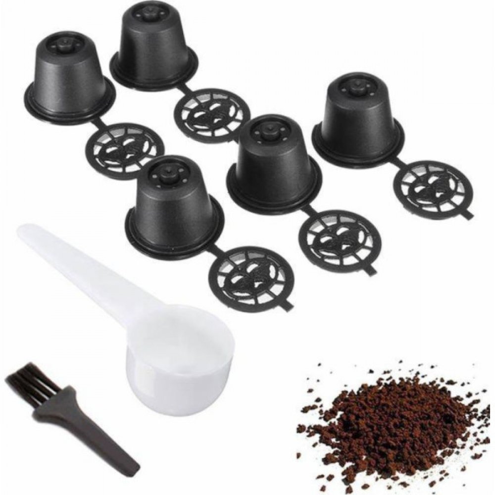 Sada 5 opakovaně použitelných kávových kapslí. Každá kapsle umožňuje uvařit kávu až 100x díky opakovaně použitelnému ocelovému filtru. Nemusíte stále kupovat nové, drahé kapsle! Nevšední snadné použití (stačí naplnit kapsli kávou, zavřít víko a vložit do kávovaru otvorem dovnitř). Výrobek je kompatibilní s kávovary Nespresso. Sada obsahuje odměrku a čisticí kartáček.