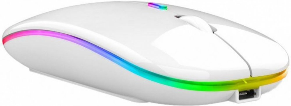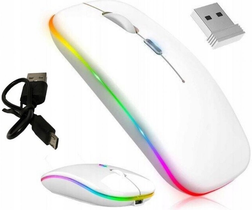 Bezdrátová optická myš s RGB LED podsvícením. Moderní design myši a vysoká ergonomie zajišťují vysoký komfort používání. Napájení pomocí vestavěné baterie (nabíjení pomocí přiloženého kabelu). Nevyžaduje žádné další ovladače (funguje ihned po připojení vysílače k USB portu nebo přes Bluetooth). Myš má možnost změnit rozlišení DPI pomocí vyhrazeného tlačítka. Vlastnosti produktu: Bezdrátová optická myš s estetickým RGB LED podsvícením . Navrženo pro stolní počítače a notebooky. Ergonomický tvar a nízká hmotnost umožňují pohodlné ovládání myši. Dokonale padne do ruky, nezpůsobuje únava během provozu. Funguje ihned po připojení vysílače k portu USB nebo přes rozhraní Bluetooth. Nevyžaduje instalaci žádných ovladačů (Plug & Play). Možnost změnit rozlišení DPI pomocí vyhrazeného tlačítka. Specifikace: Materiál: plast Napájení: vestavěná baterie Rozhraní: USB (2,4 GHz rádio) / Bluetooth RGB LED podsvícení Rozlišení: 1600, 1200, 1000 DPI (lze měnit pomocí vyhrazeného tlačítko) Počet tlačítek: 4 + rolování Plug technology & Play (nevyžadují se žádné ovladače) Kompatibilní se systémem Windows 7 a vyšším Rozměry: 11 cm x 6 cm x 2,5 cm Barva: bílá Balení: kartonová krabice