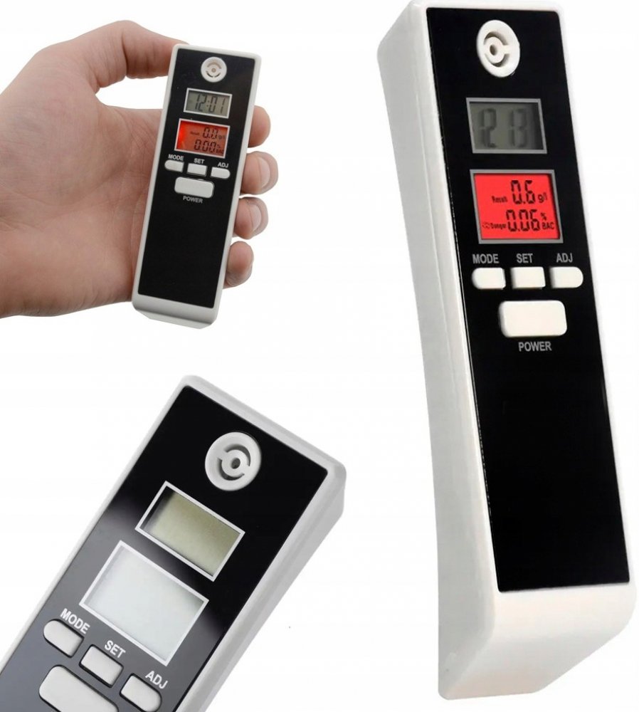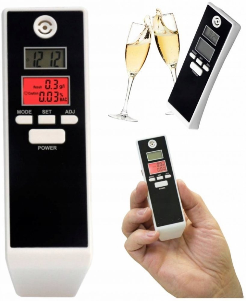 Digitální alkohol tester, beznáústkový s vestavěným teploměrem a budíkem - užitečné zařízení pro každého řidiče. Vyznačuje se přesným (0,01% %BAC) měřením obsahu alkoholu v krvi.