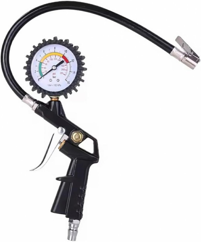 Kompaktní pneumatická pistole pro huštění pneumatik. Jednoduchá konstrukce přístroje usnadňuje práci a přehledný indikátor umožňuje zobrazit aktuální tlak ve více jednotkách současně (PSI / BAR). Pohodlná, flexibilní hadice se standardním ventilem zajišťuje pohodlné ovládání zařízení.Specifikace:Materiál: PP plast + kovPřehledný indikátor (tlakoměr)Maximální tlak: 230 PSI (16 bar)Typ ventilu: standardníPrůměr (měřidlo): 7 cmDélka hadice (s ventilem): 35 cmVýška: 24 cmČerná barva