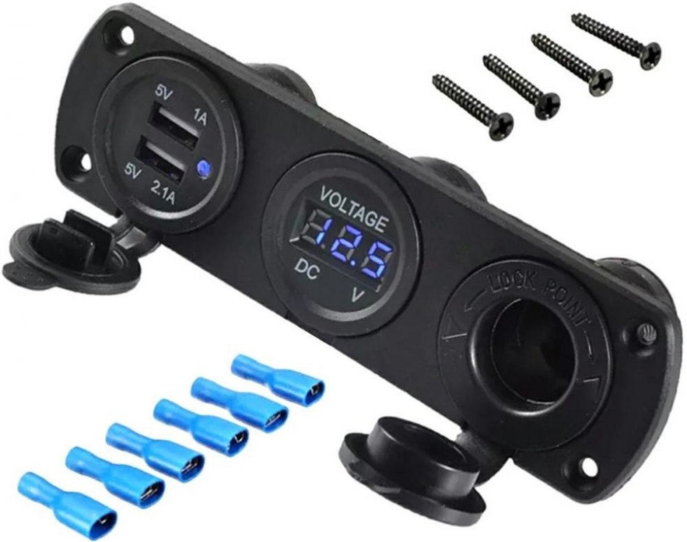 Vodotěsná zásuvka zapalovače se dvěma USB 5 V porty a vestavěným voltmetrem. Perfektní pro použití v autech, motocyklech, mopedech, čtyřkolkách a skútrech, ve všech vozidlech, která mají 12 V zapalovač. Umožňuje použití dalších dvou USB portů s proudem 2,1 A a 1 A při zachování plné funkčnosti autozapalovače a vestavěného voltmetru s displejem, umožňujícím měření aktuálního napětí.