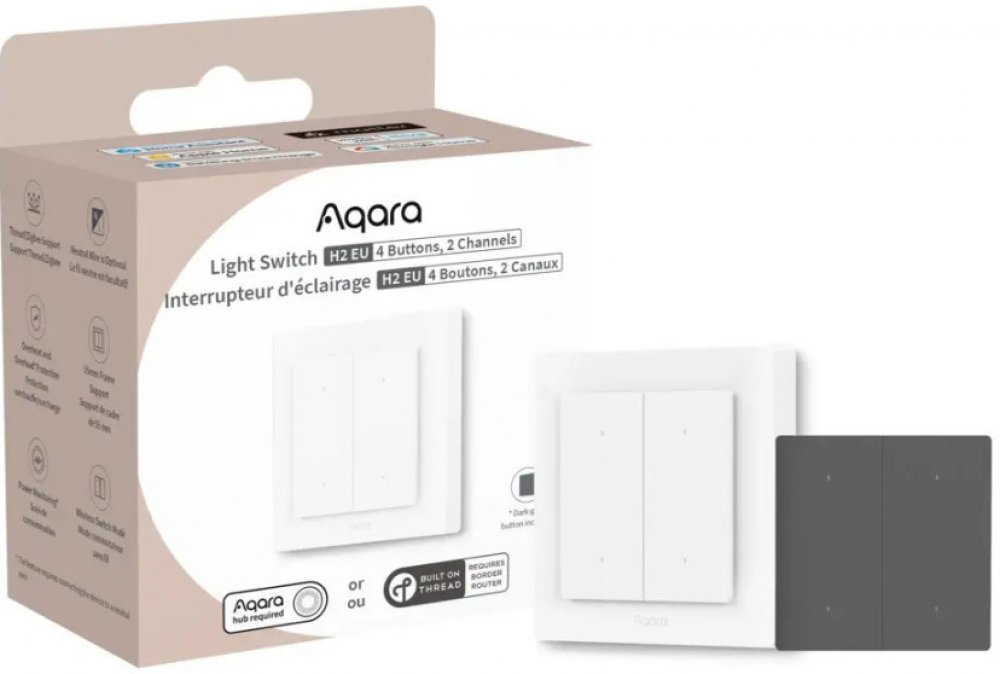 Aqara Light Switch H2 EU je inteligentní vypínač založený na komunikačním protokolu Matter over Thread a Zigbee, který dokáže ovládat světla a další zařízení. Hodí se na standardní 55 mm rámy vypínačů a podporuje volitelné zapojení neutrálního vodiče. Umožňuje dálkové ovládání, plánování, monitorování napájení, režim bezdrátového přepínání a další funkce.