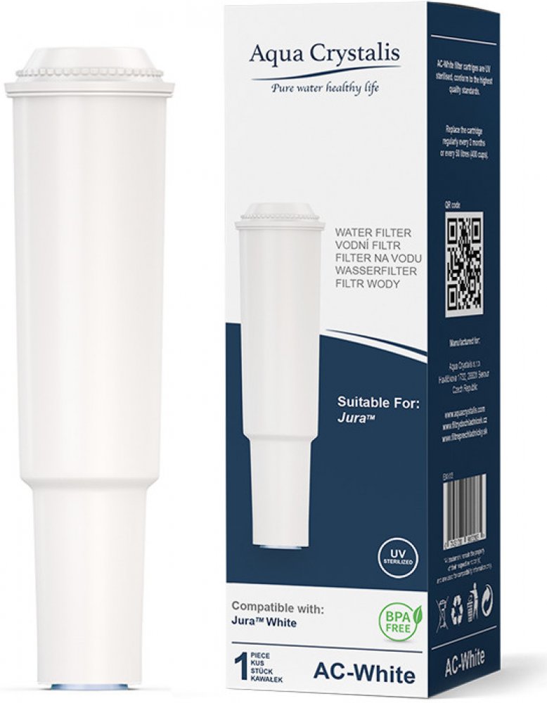 Vodní filtr Aqua Crystalis AC-WHITE, kompatibilní s originálním filtrem Jura CLARIS WHITE, vodu před každou přípravou kávy spolehlivě přefiltruje a zanechá ji tak ve výborné kvalitě pro přípravu perfektního šálku kávy. Chrání Váš kávovar před usazováním vápníku (vodního kamene) a tím se zvyšuje jeho životnost. Navíc při používání filtru není potřeba kávovar odvápňovat. Byl navržen speciálně dle potřeb plnoautomatických kávovarů JURA, neovlivňuje chuť kávy a je umístěn přímo do nádržky s vodou. Filtr AC-WHITE je účinný pro 50 litrů vody (to je asi 400 káv - kávovar Vám automaticky signalizuje nutnost jeho výměny), anebo po dobu 2 měsíců. Jeho výměna je velmi rychlá a jednoduchá. Nepoužívejte filtr v kávovaru déle než dva měsíce a nejpozději po 2 měsících jej vyměňte. V opačném případě by hrozilo zanesení kávovaru vodním kamenem.
