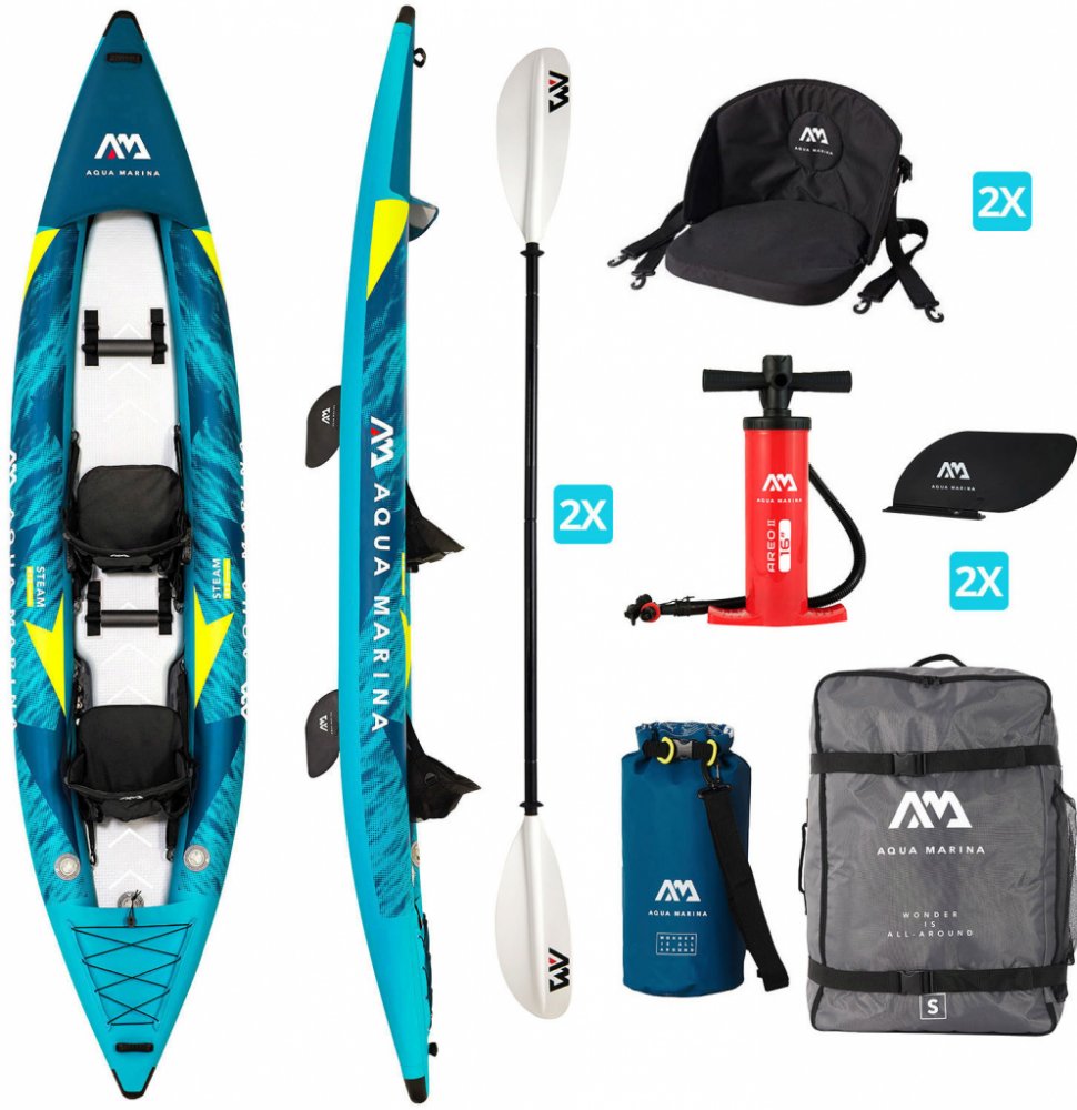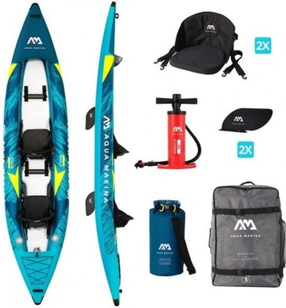 Aqua Marina Parní kajak ST-412 Set: dvě pádla KP-1Parní kajak o délce 13 stop a 6 palců je určen pro plavání v oceánu. Byl navržen s pevnou kuželovitou přídí ve tvaru V a PVC palubou s kapkovitým stehem pro zlepšení směrové stability při plavání venku. Má samovypouštěcí ventily, které lze otevřít za špatného počasí a zavřít za lepšího počasí. To umožňuje splutí peřejí třídy 3 a také zlepšuje směrovou stabilitu na otevřené vodě. Vylepšená sedačka s kapkovitým stehem umožňuje používat kajak samostatně nebo s další osobou, v závislosti na modelu.V sadě s kajakem najdete mimo jiné 2 pádla kp-1, pumpu, 2 ploutve a 2 sedačky do kajaku.Kajak je vyroben ze zesíleného plastu se sníženou palubou:Odnímatelná podlaha s kapkovitým stehem s vysokou tuhostí a tloušťkou 7 cm. Zajišťuje větší tuhost a stabilitu.Dvě boční vzduchové komory pro stabilitu a bezpečnost.Paluba ze zesíleného, vysoce kvalitního plastuVysoce kvalitní sedačka kajakuHlavní vlastnosti kajaku STEAM ST-412: Super tvrdý, zesílený PVC materiál pro vzduchové komory a dno kajaku. Dvouvrstvá, 7 cm silná podlaha z kapkovitého materiálu. Vysoce kvalitní sedačka kajaku pro oporu zad a pohodlí při plavání. Gumové polstrování kolem ventilu pro zlepšení těsnosti panelu 2 odnímatelné ploutve kajaku pro vynikající směrovou kontrolu Odolné gumové úchyty na přídi a zádi desky pro přenášení kajaku Nastavitelná pěnová opěrka nohou poskytuje oporu pro chodidla Superrychlé samočinné vypouštěcí ventily Prodloužená ochrana proti stříkající vodě na přídi 16" ruční pumpa pro rychlé a snadné nafouknutí kajaku Rozdíly oproti modelu 2021: nový grafický design, nová pumpa, batoh na přenášení kajaku, 10l vodotěsný vak v baleníSPECIFIKACE: - KAJAK JE VYROBEN Z KVALITNÍHO MATERIÁLU, KTERÝ JE VHODNÝ PRO POUŽITÍ V PŘÍRODĚ: Model: ST-412 velikost: 412x90 cm Počet pasažérů: 1 hmotnost kajaku: 15,5 kg Nosnost: 180 kg Počet vzduchových komor: 2+1 Vypouštěcí ventily: 1+16 samovypouštěcí Ploutve: 2 ploutve kajakuPŘÍSLUŠENSTVÍ: Ruční pumpa 16" Kajakářský batoh (M) 2x kajakářské ploutve 2x sedátko do kajaku 2x kajakářské pádlo KP-1 Vodotěsný vak 10l