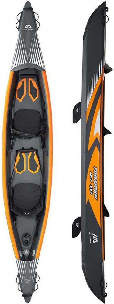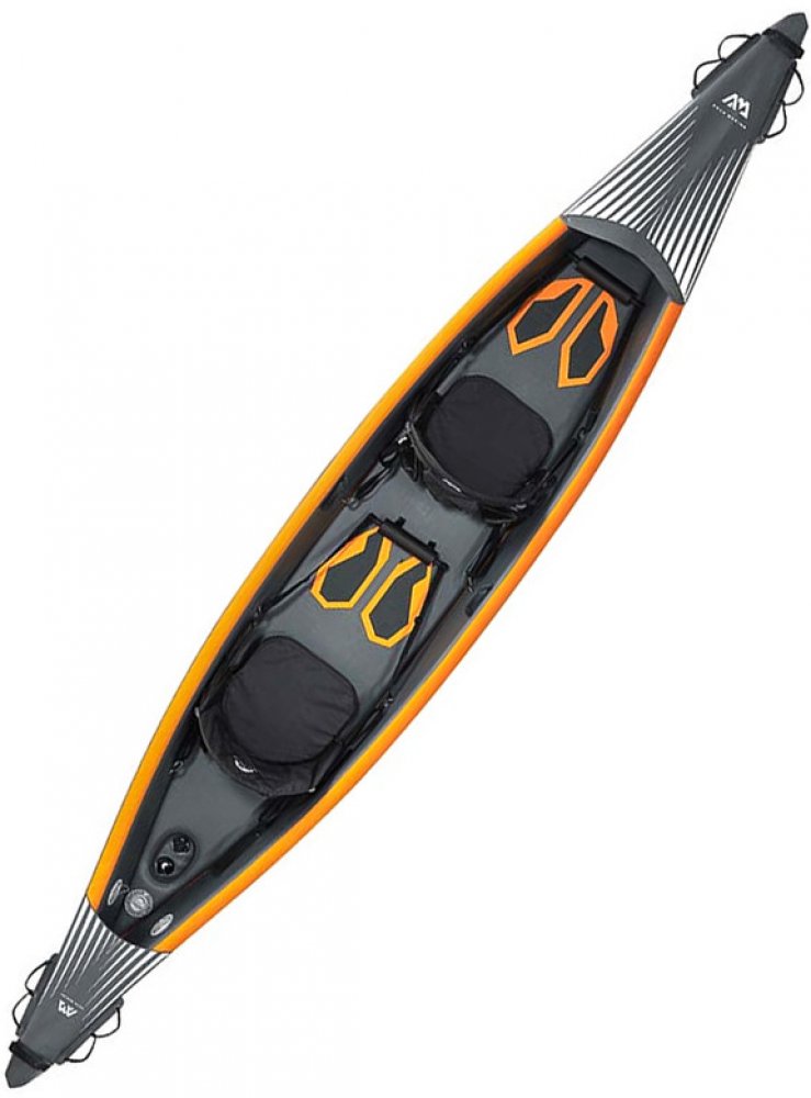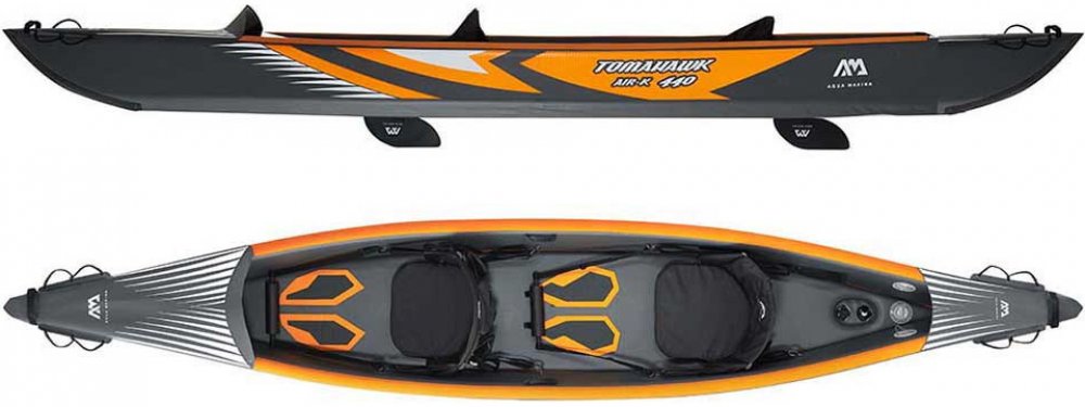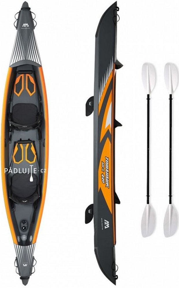 Nafukovací dvoumístný kajak Aqua Marina Tomahawk K440 o nosnosti až 210 kg je vhodný pro vodáky všech schopnostních kategorií. Tento kajak klade důraz na ovladatelnost a rychlost při zachování komfortu a stability. Konstrukce napomáhá skvělému držení stopy, ale loď zároveň rychle reaguje na změny směru a rychle se vrací do stabilní polohy, což ocení i začínající vodáci. Nosnost kajaku Aqua Marina Tomahawk K440 je až 210 kg, takže hravě zvládne odvézt i dvě těžší osoby is nákladem. Dvoumístný kajak Aqua Marina Tomahawk K440 je skvělým plavidlem pro všechny dobrodruhy. Vyber se na něm na jezero za domem zapádlovat si s kámošem nebo zažij dobrodružství na řece s rodinou. Nezapomeň si ho vzít na dovolenou k moři. Tvar kajaku v písmenu V se zvednutou špičkou a zádí umožňuje skvělé držení směru a hravé prořezání menších vln. Navíc se s ním jednoduše cestuje. Rychle a bez problémů ho vyfučíš a sbalíš do přiloženého přepravního batohu. Jeho tři vysokotlaké ventily zajistí, že kajak vždy snadno a bezpečně nafoukáš až do 10 PSI. Kajak Aqua Marina Tomahawk K440 o délce 440 cm je vyroben pomocí drop-stitch technologie. Jeho stěny i dno jsou tak pevné a jízda na něm je k nerozeznání od jízdy v pevném kajaku. Kajak Aqua Marina Tomahawk K440 disponuje dvěma pohodlnými nastavitelnými vysokými sedadly s pěnovými sedadly a kapsami na odkládání drobností, dvěma opěrkami pro nohy a dvěma ploutvemi pro efektivní držení směru. Příď i záď je vybavena ochranou proti vnikající vodě.