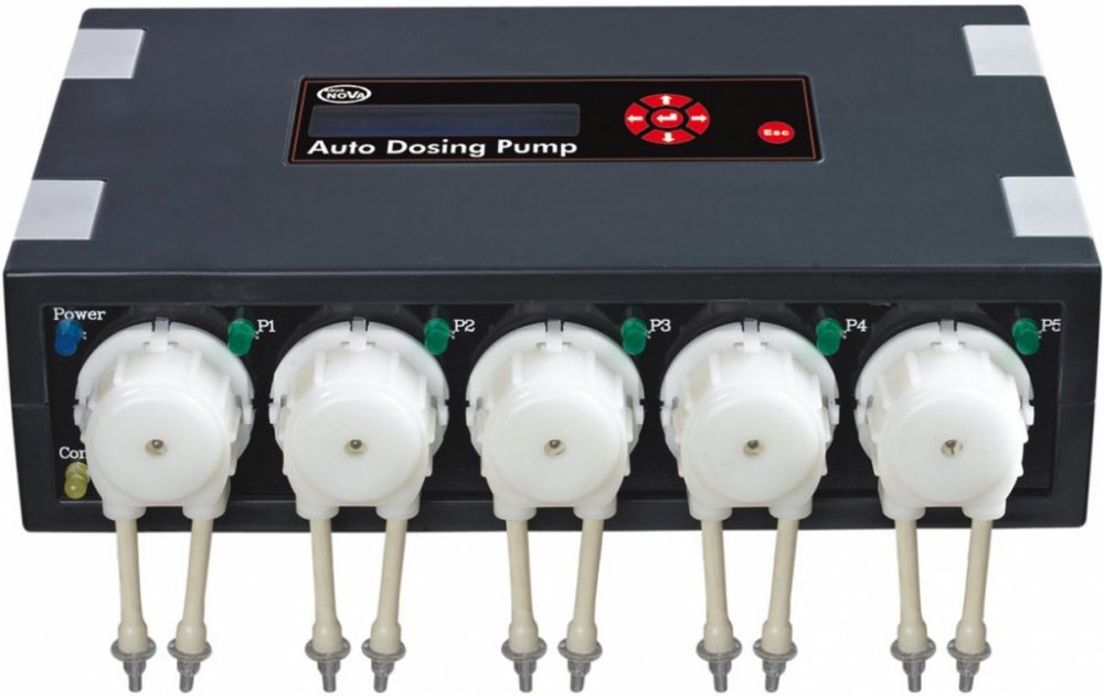 Dávkovací čerpadlo Aqua Nova NMDP-5 je vhodné pro dávkování: hnojiv, solí, léčiv, přípravků pro úpravu vody do akvária. Vhodné pro sladkovodní i mořská akvária.Sestává ze čyř samostatně programovatelných pump, které mají dvě hadičky (vstup a výstup kapaliny). Jedna hadička se ponoří do nádoby s tekutinou a druhá do akvária. Pumpa následně čerpá kapaliny do akvária podle zvoleného programu.- přesnost dávkování: 1 ml- maximální průtok: 5 x 70ml/h - příkon při činnosti pump: 8,5 W- výtlak (dopravní výška): 1,5 mPro každou pumpu lze naprogramovat až 24 dávek v intervalech hodin až 30 dnů. Tímto systémem lze dávkovat více hnojiv do jedné nádrže nebo např. kompletní hnojivo do více akvárií různých objemů.