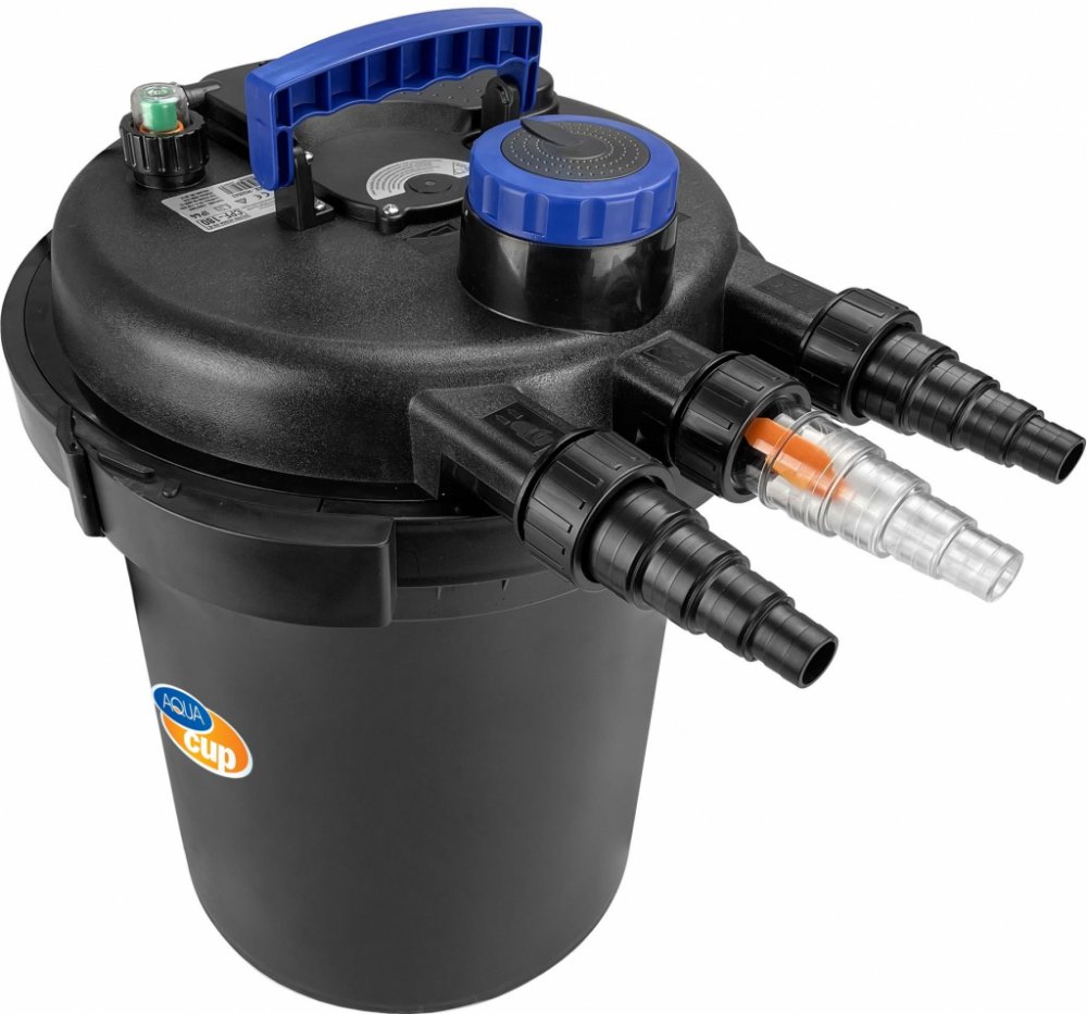 Uzavřený tlakový filtr určený pro okrasná zahradní jezírka do maximálního objemu 10 m3.