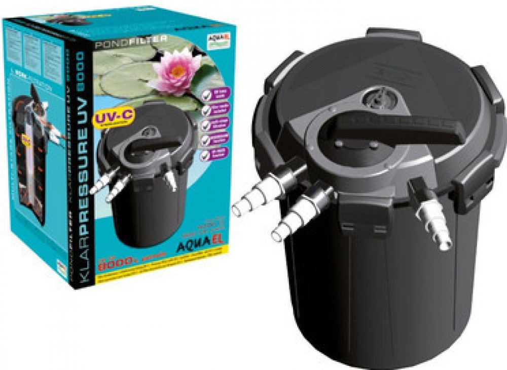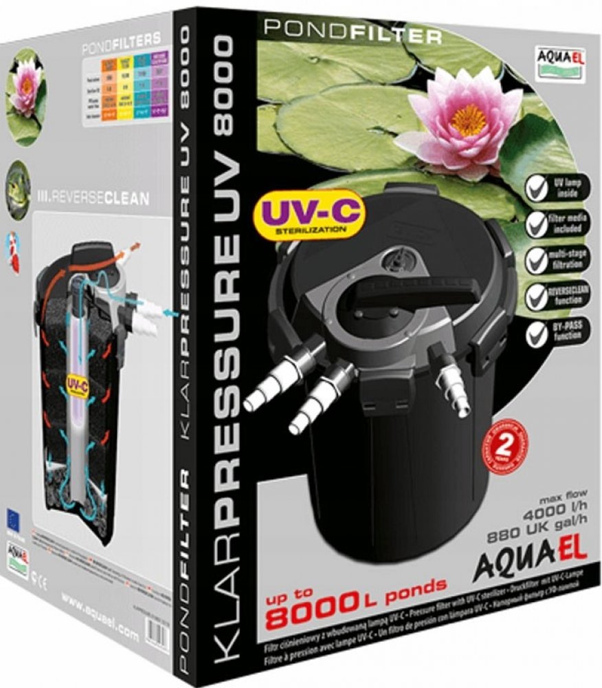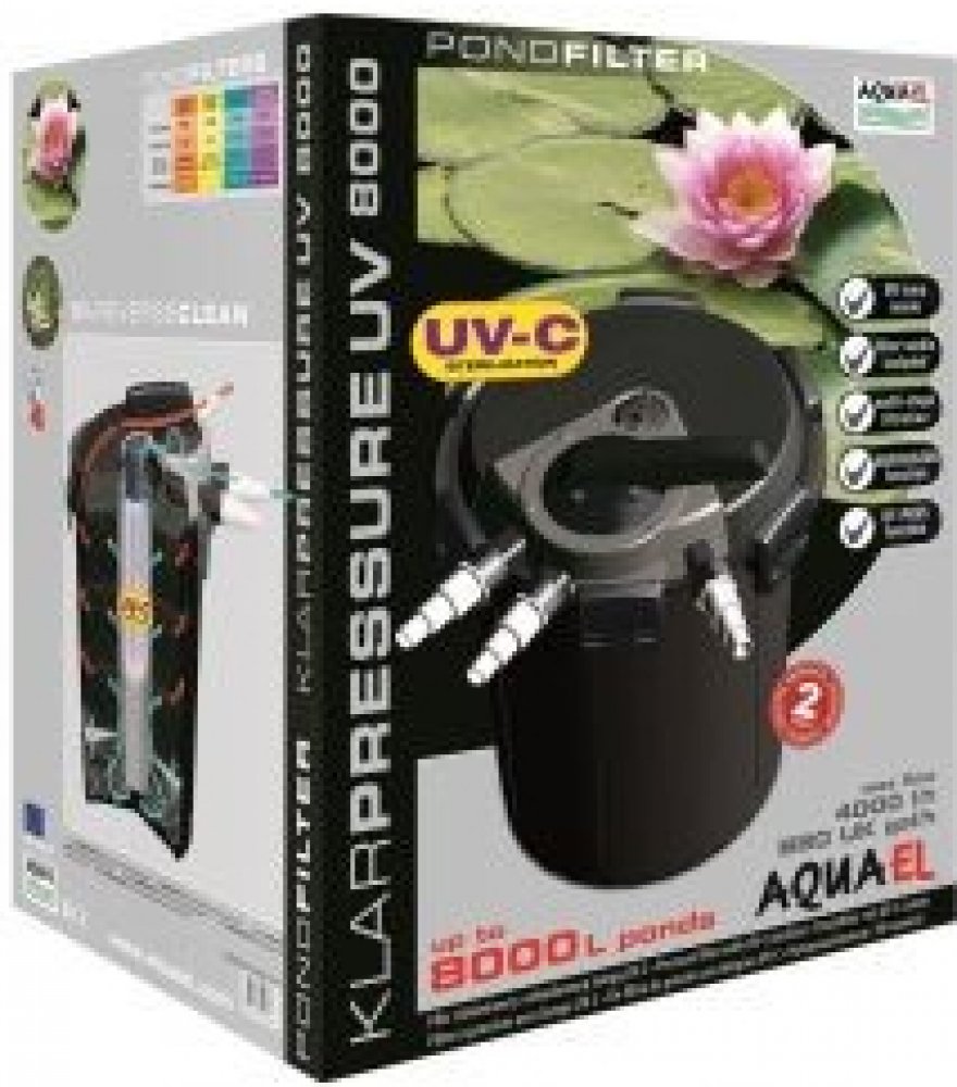 Velmi kvalitní tlakový filtr KLARPRESSURE UV 8000 je určen pro nádrže o velikosti do 8000 L vody. Filtr je vybaven velkou filtrační plochou - akvacitovým molitanem a bio - kuličkami. Součástí filtru je UV lampa 11 W. Filtr má vlastní čistící okruh, proto se velmi snadno čistí. Doporučený max. průtok 4000 L / h. Záruka 24 měsíců. Toto zařízení ač je velmi výkonné, je jedinečné svými malými rozměry. Tento filtr je možné doporučit všem estétům, kteří si neradí kazí vzhled okolí svého jezírka velkými krabicemi nebo je nemají možnost dobře zamaskovat.
