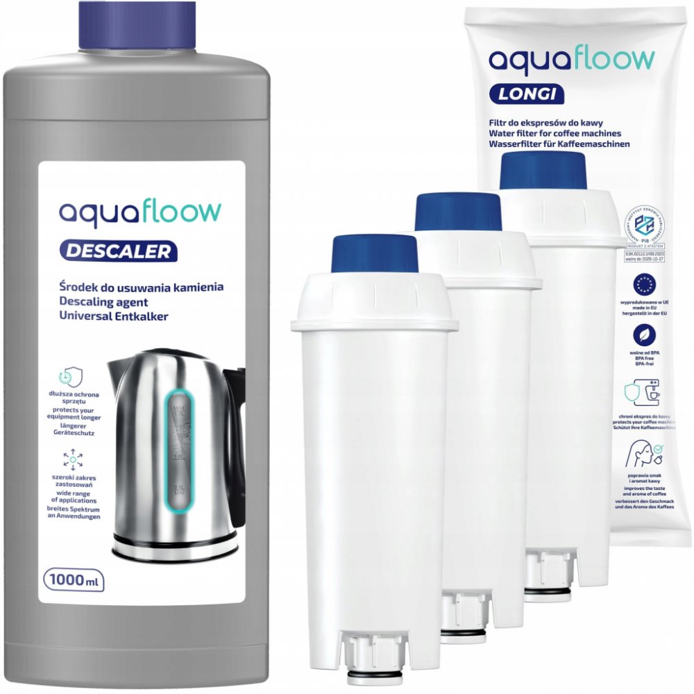 Sada AquaFloow pro kávovar Delonghi: 3 x filtr na vodu + odvápňovač 1 l
