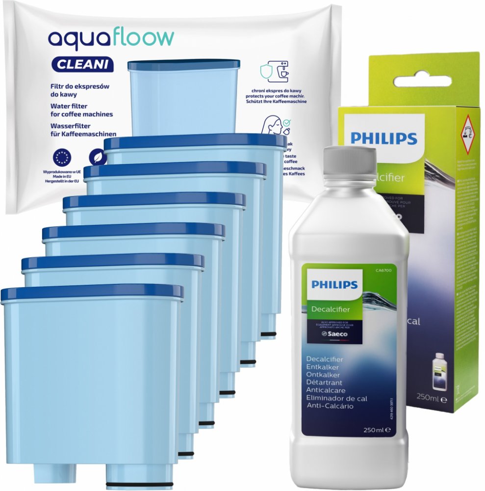 Sada pro kávovary Philips / Saeco: originální odvápňovač Philips CA6700 250 ml + vodní filtr AquaFloow Cleani