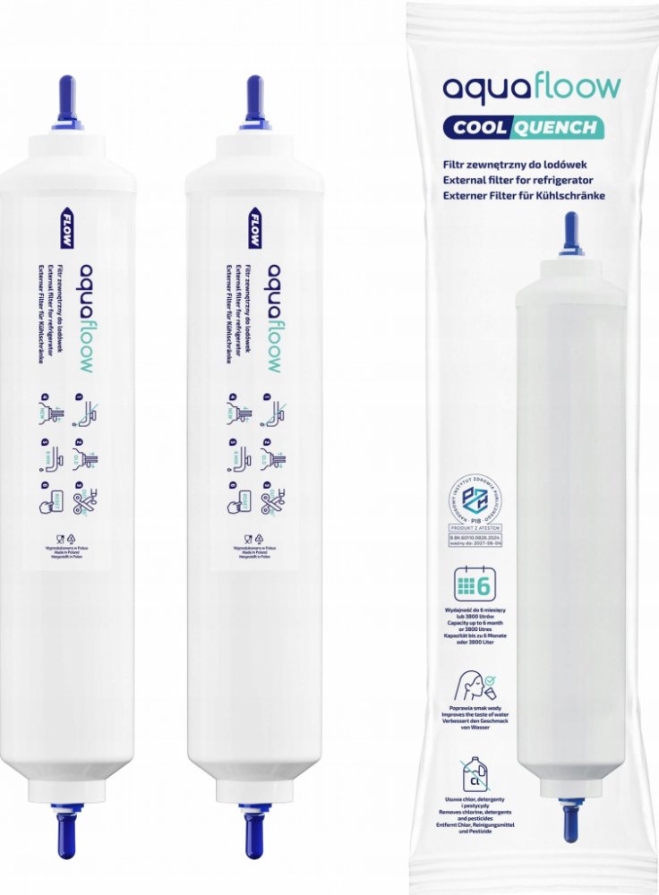 Vodní filtr polské značky AquaFloow do lednic, které mají externí kartušový nástavec pomocí hadice . Filtr je vybaven speciální vložkou s kokosovým uhlím, která účinně eliminuje nepříjemnou chuť a zápach chlorované vody a také odstraňuje nečistoty a usazeniny.