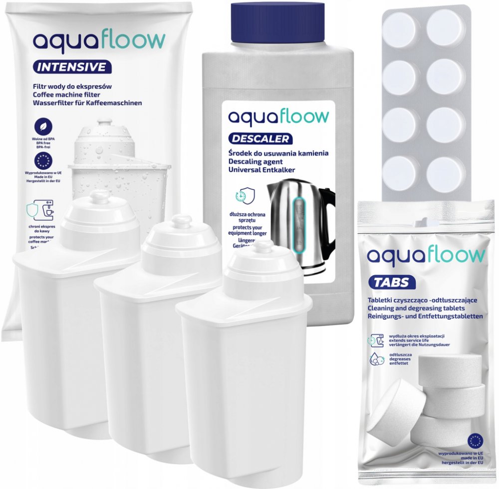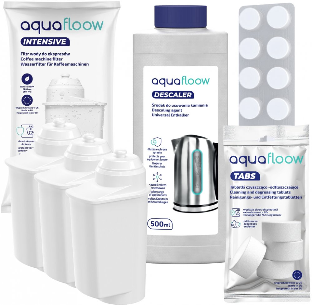 Sada AquaFloow pro kávovar Siemens: 3 x vodní filtr + čisticí a odmašťovací tablety + odvápňovač 250 ml