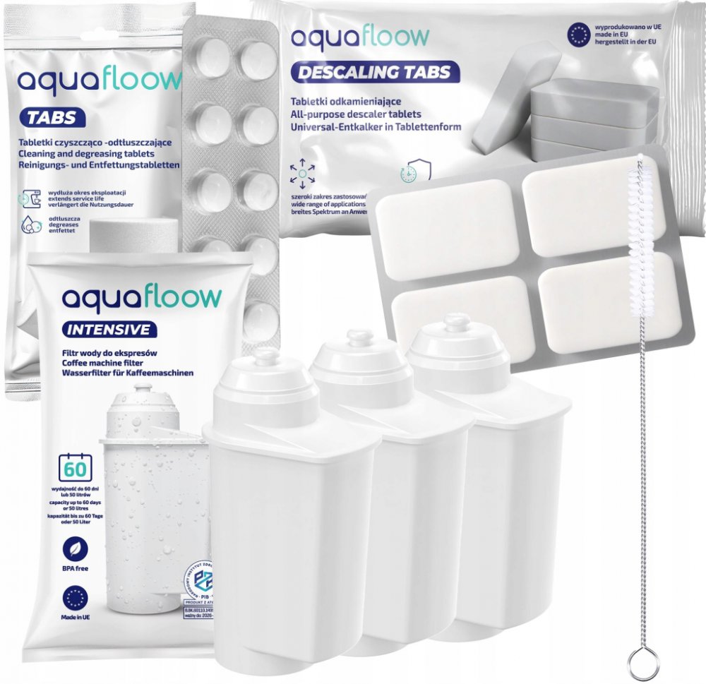 Sada AquaFloow pro kávovar Siemens: 3 x vodní filtr + čisticí a odmašťovací tablety + odvápňovač v tabletách + vytěrák