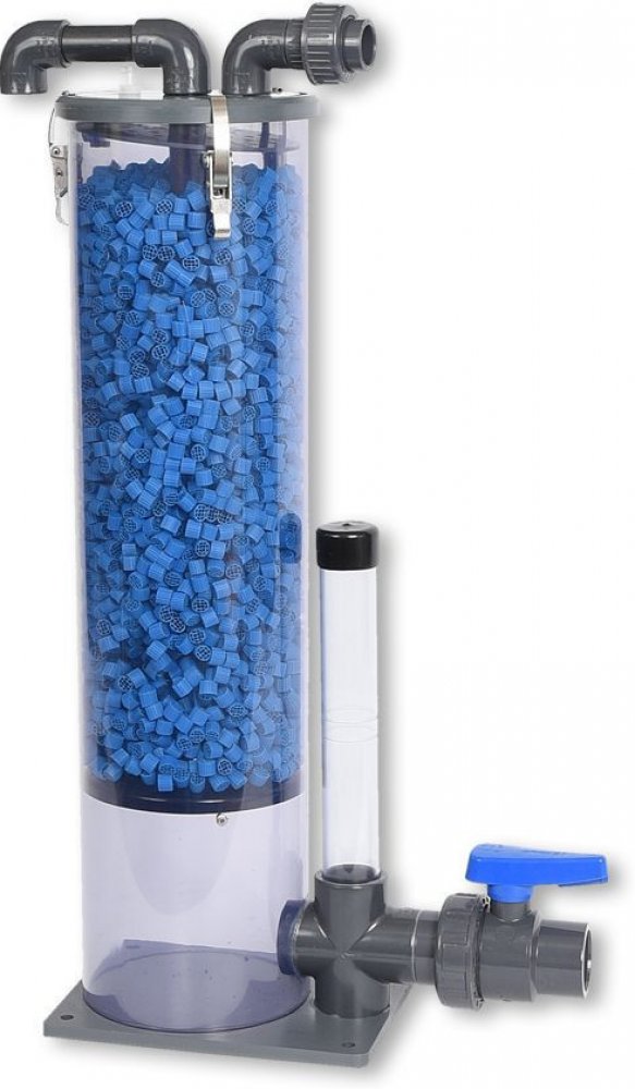 Vylepšený model s kulovým ventilem pro regulaci průtoku a speciálními novými biokroužky pro ještě lepší promíchání kyslíku.Díky kulovému ventilu je mnohem jednodušší nastavit správnou hladinu vody. Přes 4mm vzduchovou přípojku a dodávaný průtokoměr vzduchové čerpadlo nepřetržitě pumpuje 0,5 l/min (30 l/h) vzduchu do filtru. Tento tlak zajišťuje vytlačení pěny z filtru přes výstupní trubici pěny.Proteinový skimmer je kombinací biologického, mechanického a chemického filtru. Princip funguje následovně: povrch vzduchové bubliny přitahuje látky rozpuštěné ve vodě. V důsledku přitahování vzduchových bublin se chemikálie, částice nečistot, barviva a řasy koncentrují. Vzduch se mísí s vodou pomocí vzduchového čerpadla. Protlačením této směsi přes filtrační materiál (biokroužky) do spodního vývodu vzniká velmi dlouhá doba kontaktu mezi vodou a vzduchem. Tím se průběžně mění povrchové napětí vody a vytváří se pevná pěna. Tato pěna je oddělena od vyčištěné vody perforovaným kuželem a odváděna ven. Látky rozpuštěné ve vodě, jako fosfáty, amoniak, huminové kyseliny, barviva, bílkoviny a množství těžkých kovů, jsou z vody odfiltrovány a odváděny pomocí pěny.Vstup vody: 25 mmVýstup vody: 40 mmVýstup pěny: 25 mm