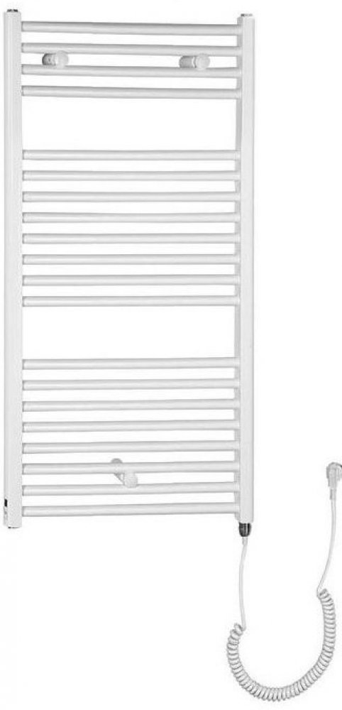 Elektrické otopné těleso s rovnými vodorovnými trubkami, v bílé barvě. Opatřeno elektrickou topnou tyčí o příkonu 300 W, kabelem a vidlicí do zásuvky.