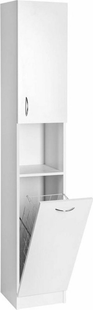 Úložný prostor: Horní část skříňky obsahuje dvířka, za kterými se nachází police vhodná pro uložení různých předmětů. Ve spodní části je výklopný prádelní koš, ideální pro uskladnění prádla.