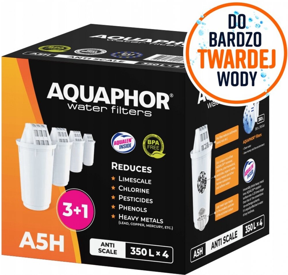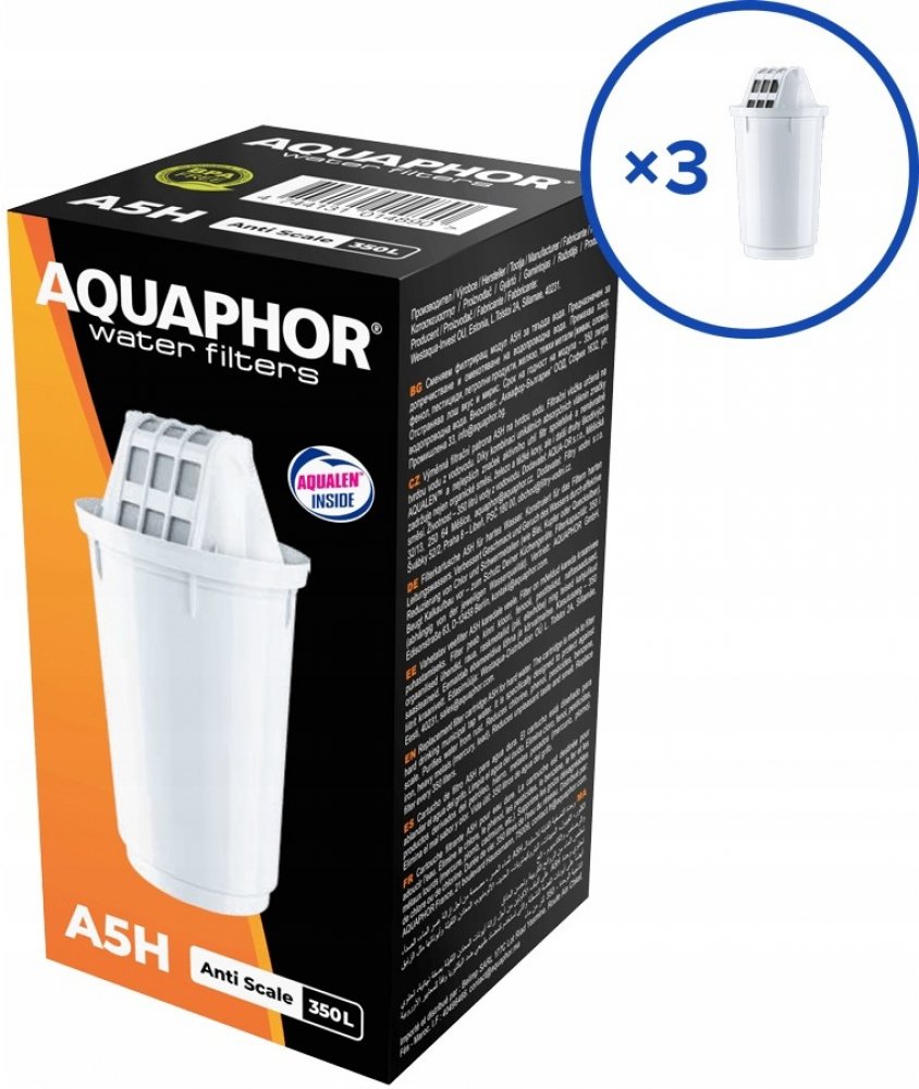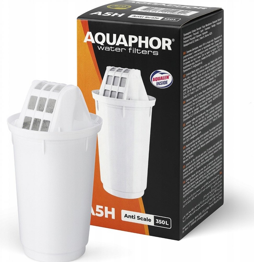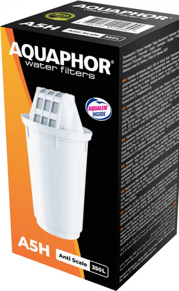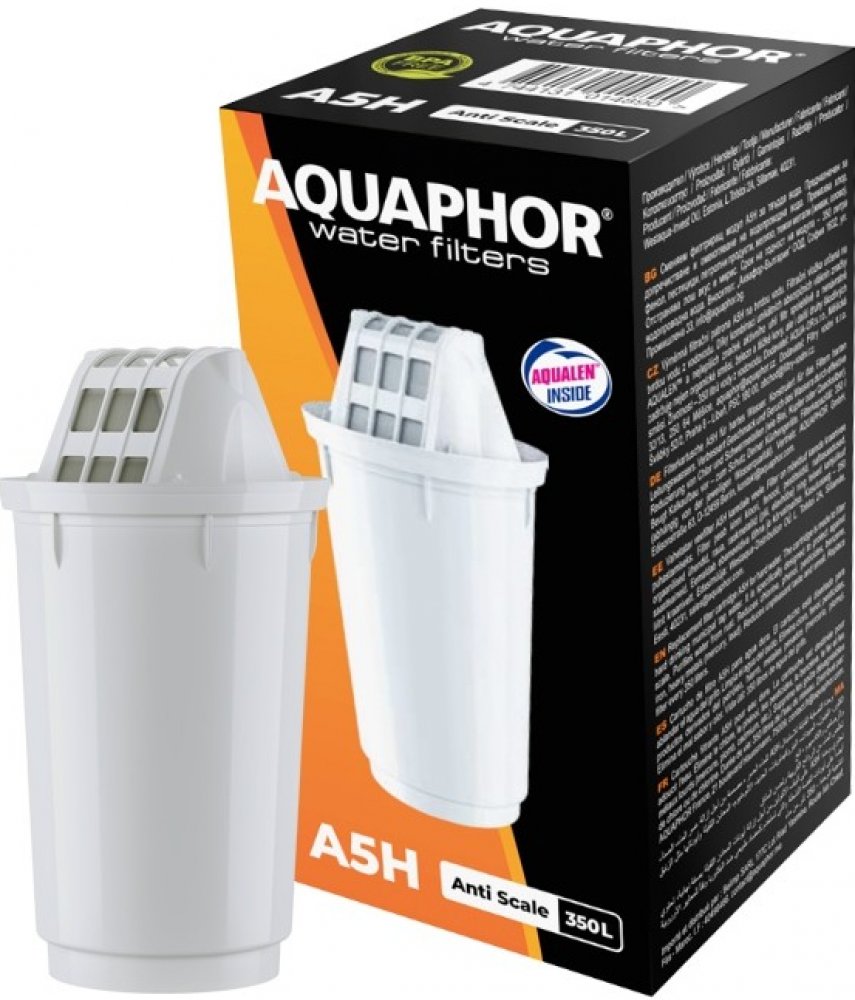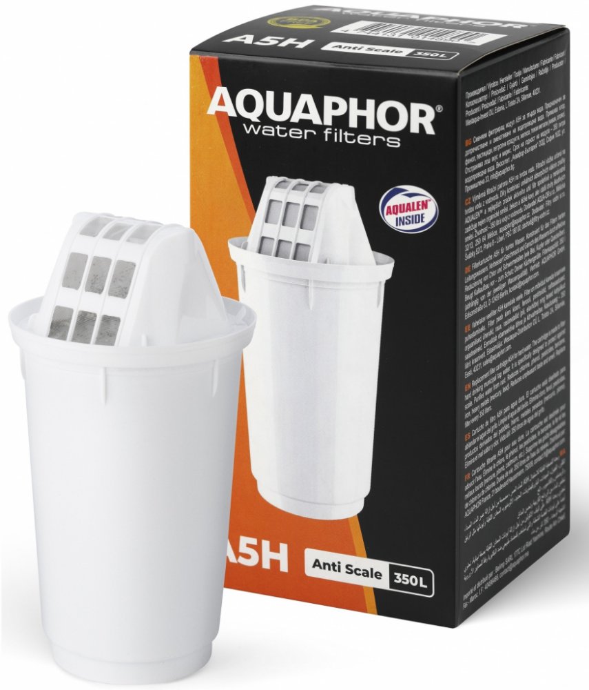 Filtr Aquaphor A5H obsahuje více filtračních médií. V kombinaci s mikropórovým uzávěrem na horní straně filtr vykazuje prodlouženou životnost filtru 350 litrů.