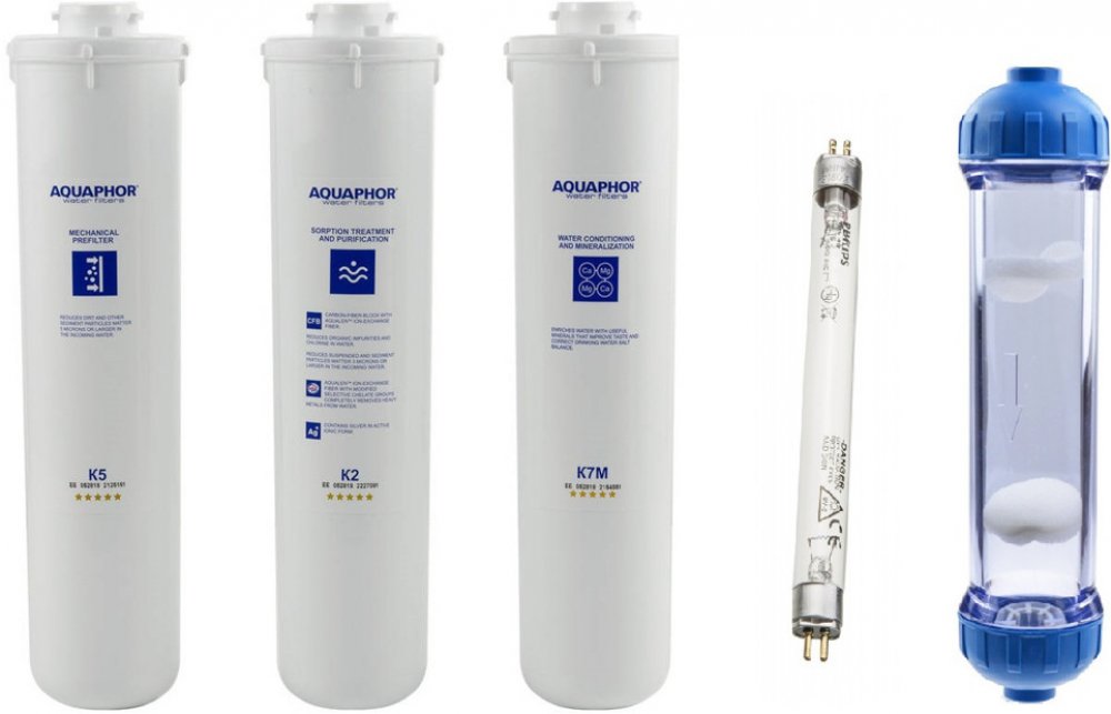 - 1. stupeň filtrace je výměnná vložka K5, která snižuje obsah aktivního chlóru, těžkých kovů a organických látek. Materiál filtru je vysoce hydrofilní, s labyrintovou strukturou pórů, takže efektivně zachycuje nerozpustné příměsi s velikostí částic nad 5 mikronů, včetně hydroxidu železitého. Je vyroben technologií karbon blok a představuje filtrační mřížku s makropóry, vyplněnými aktivním kokosovým uhlím a iontoměničovým vláknem Akvalen. Jako baktericidní prvek je použito mikrokrystalické shlukové stříbro. Intenzivní sorpční dočištění pitné vody.