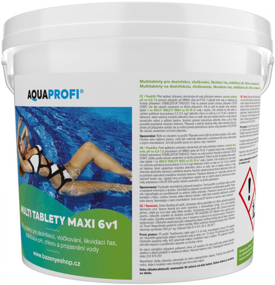 Použití: Před aplikací přípravku zkontrolujte pH vody příslušným testerem, nastavte hodnotu pH na 6,8-7,6 pomocí přípravků pH MINUS nebo pH PLUS. V případě tvrdé vody se stabilizuje její tvrdost přídavkem STABILIZÁTOR TVRDOSTI. Poté se provede prvotní chlorace přípravkem CHLOR START, vše dle návodů uvedených na těchto přípravcích. Pak se vloží do plováku nebo zásobníku tablet 1 ks MULTI TABLETY MAXI na 20-30 m3 vody v bazénu. Toto množství by mělo stačit na udržení potřebné koncentrace 0,3-0,5 mg/l aktivního chloru ve vodě na 5 až 10 dnů v závislosti na faktorech, které ovlivňují množství aktivního chloru ve vodě, jako jsou teplota vzduchu a vody, intenzita slunečního záření a zatížení bazénu. Kontrolu správné koncentrace aktivního chloru a pH je třeba provádět pravidelně vhodným testerem. Přípravek v sobě již obsahuje látky, které zabraňují růstu řas, přesto při případném výskytu řas je možné provést jednorázovou úpravu vody přípravkem CHLOR ŠOK dle návodu uvedeného na tomto přípravku.